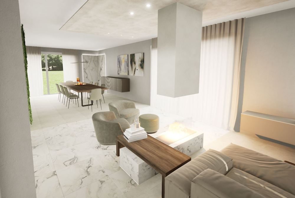 Le due aree sono separate da un camino bifacciale, che lascia la vista libera di correre lungo tutto l’ambiente.