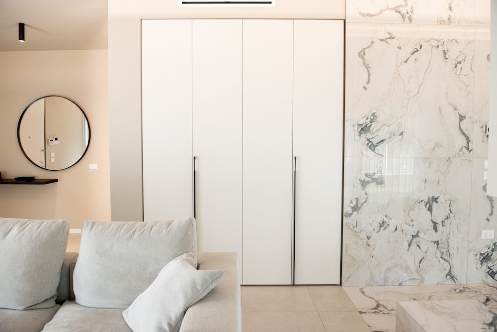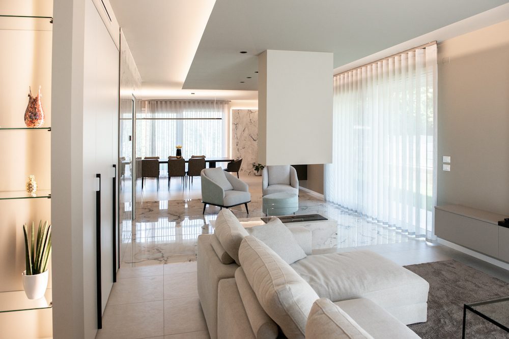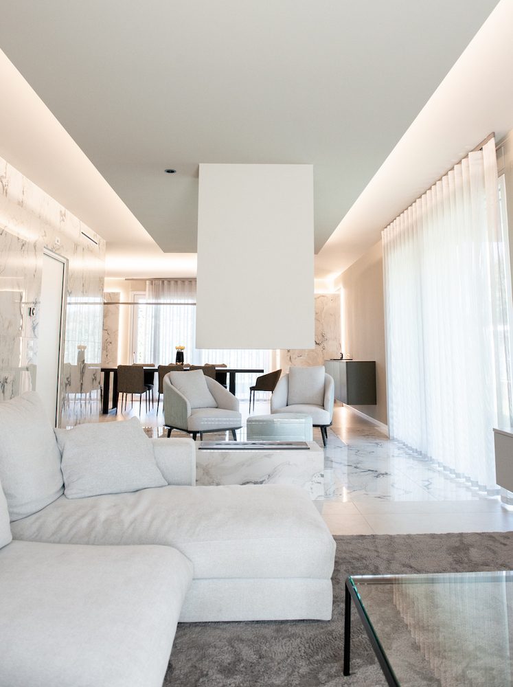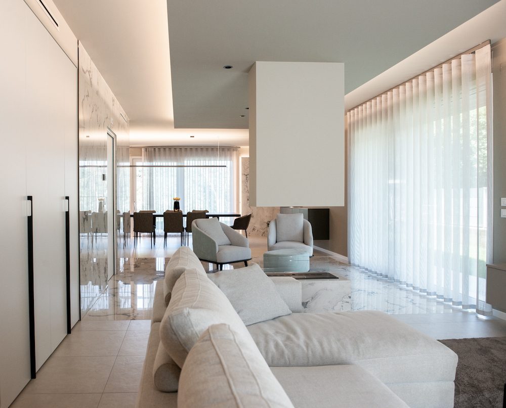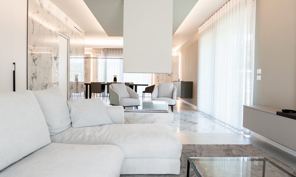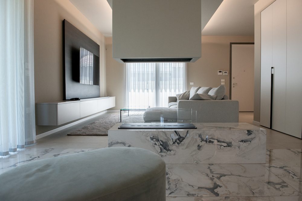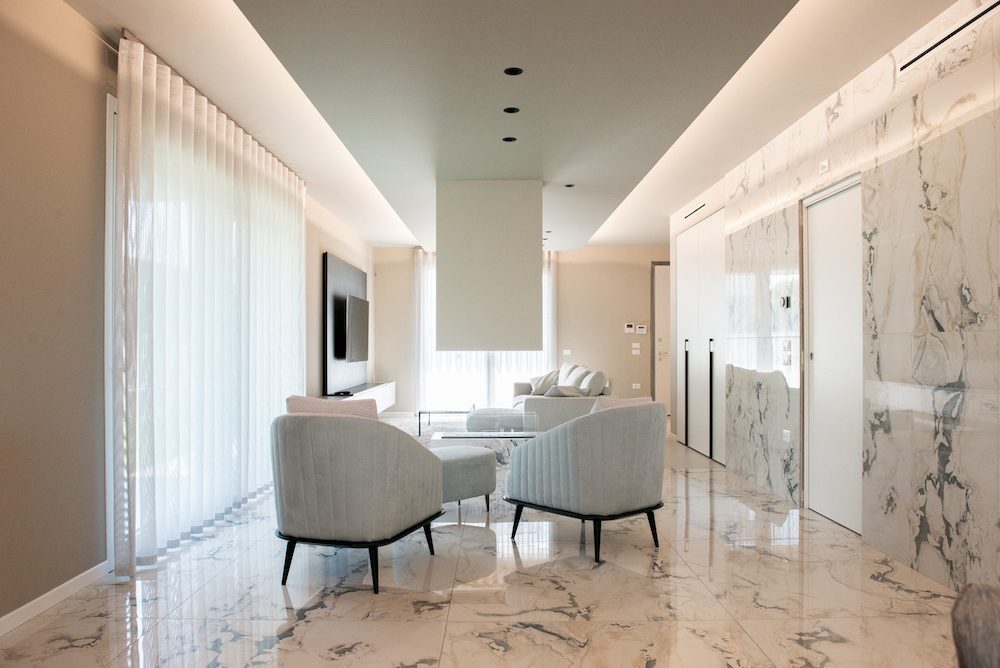 La luce del soggiorno proveniente dalle grandi finestre è messa in risalto dalle piastrelle in gres con effetto marmo San Babila che si estende su pavimenti, pareti e caminetto, e che cede il passo a toni più neutri e rilassanti per l’area adibita al relax davanti alla tv. All’eleganza si unisce la funzionalità di un’armadiatura che libera il vicino ingresso da giacche e cappotti.