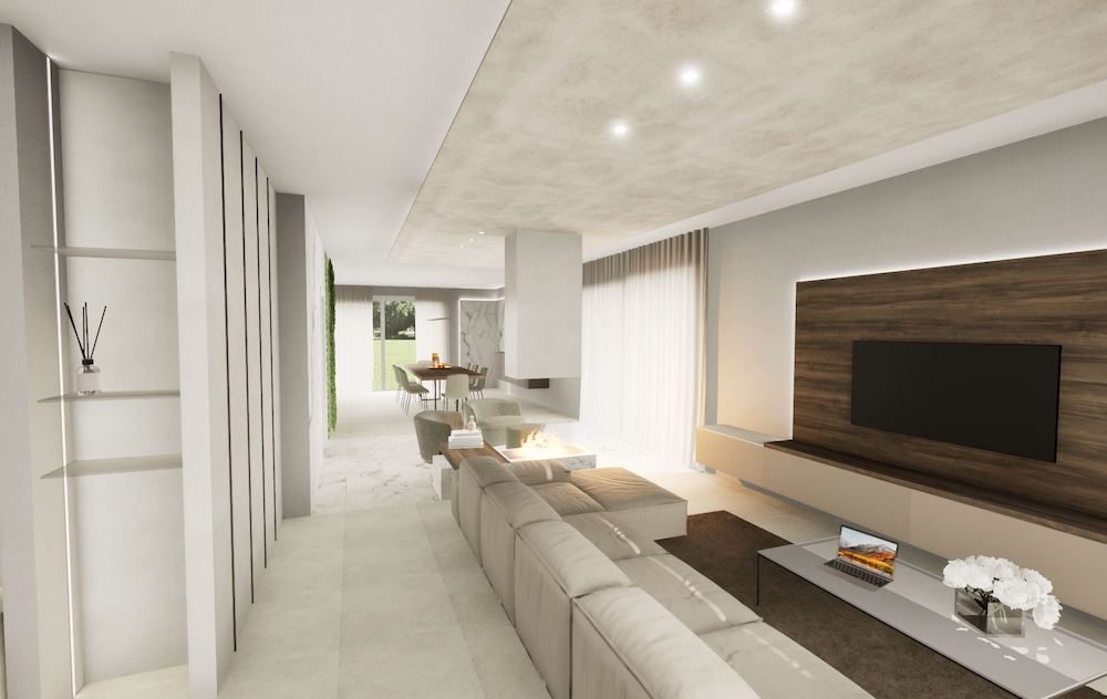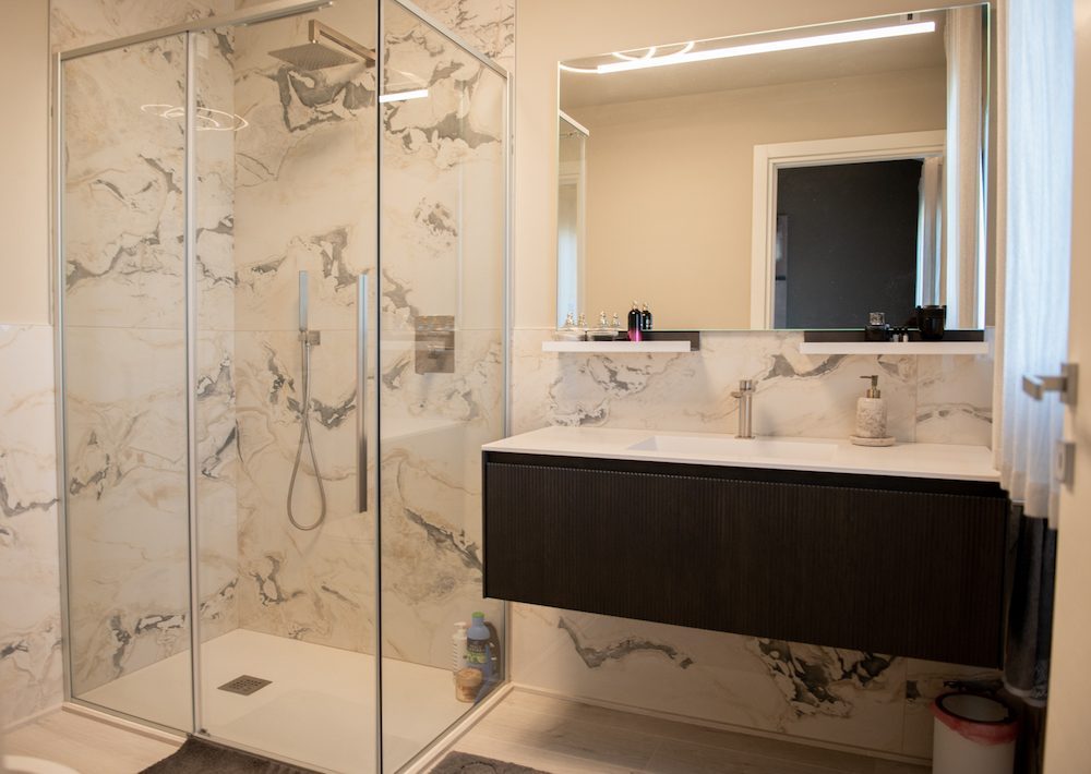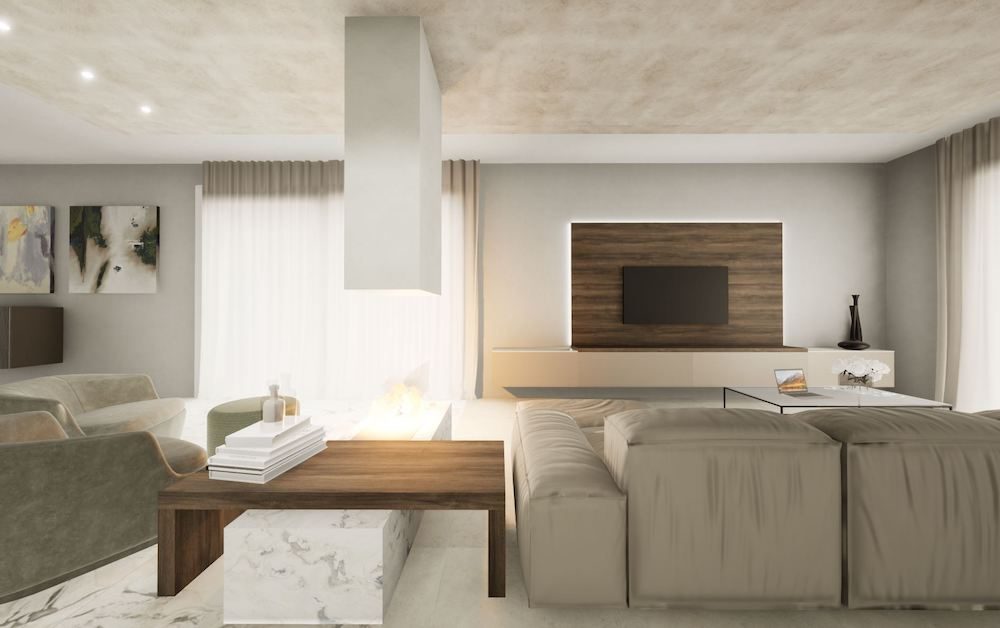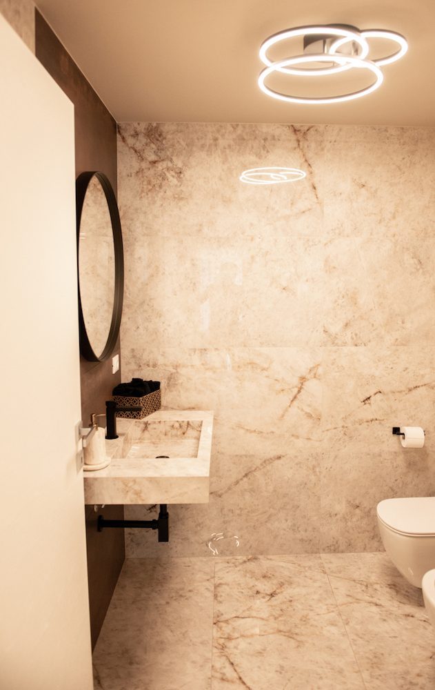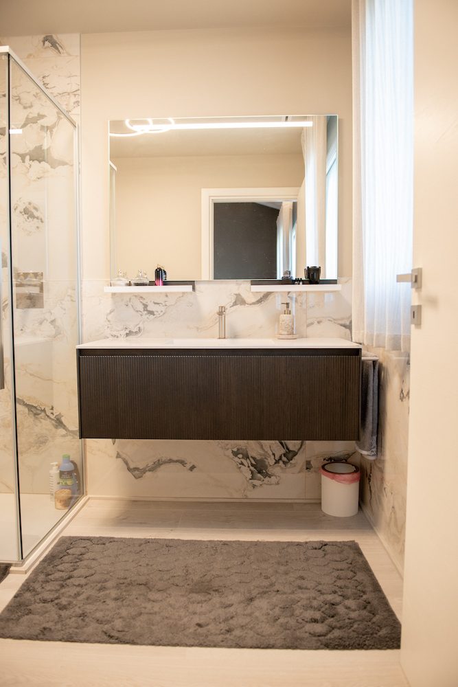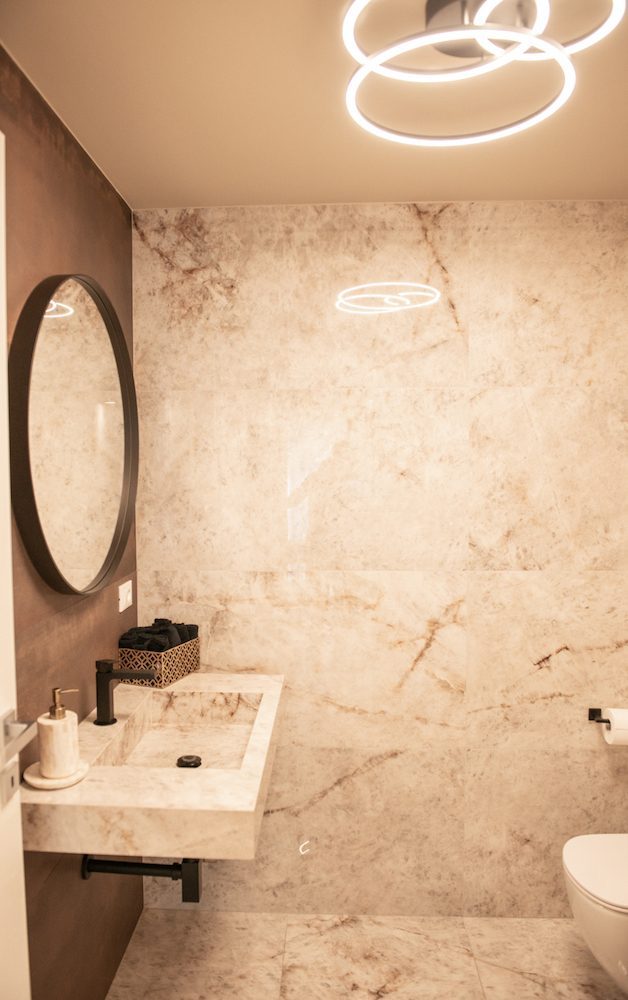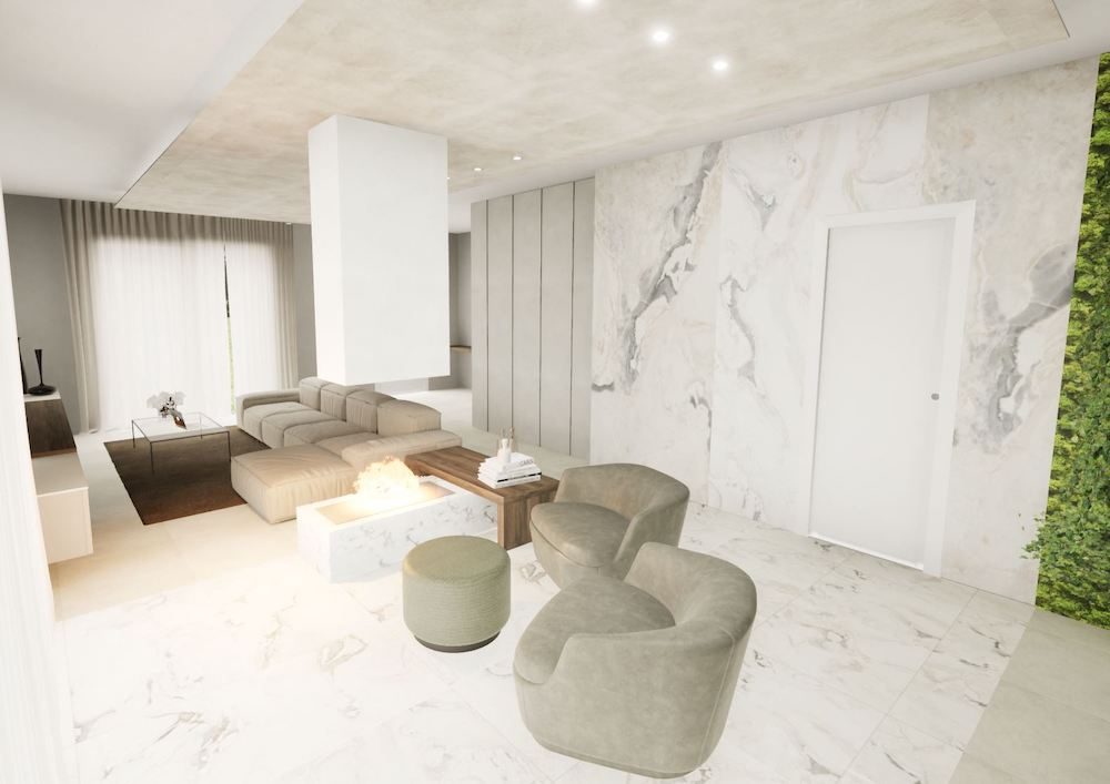 La luce del soggiorno proveniente dalle grandi finestre è messa in risalto dalle piastrelle in gres con effetto marmo San Babila che si estende su pavimenti, pareti e caminetto, e che cede il passo a toni più neutri e rilassanti per l’area adibita al relax davanti alla tv. All’eleganza si unisce la funzionalità di un’armadiatura che libera il vicino ingresso da giacche e cappotti.
