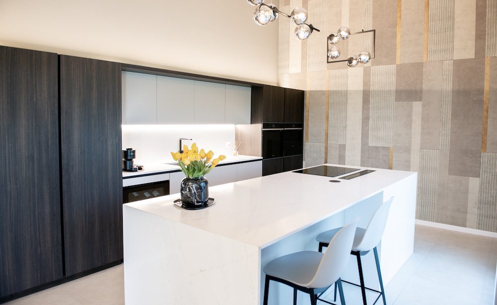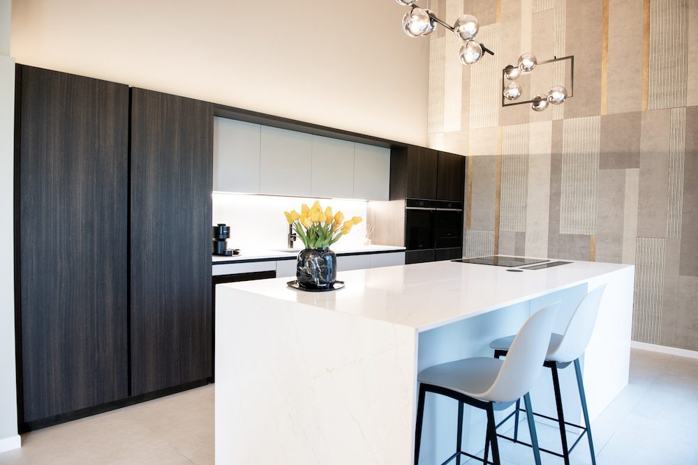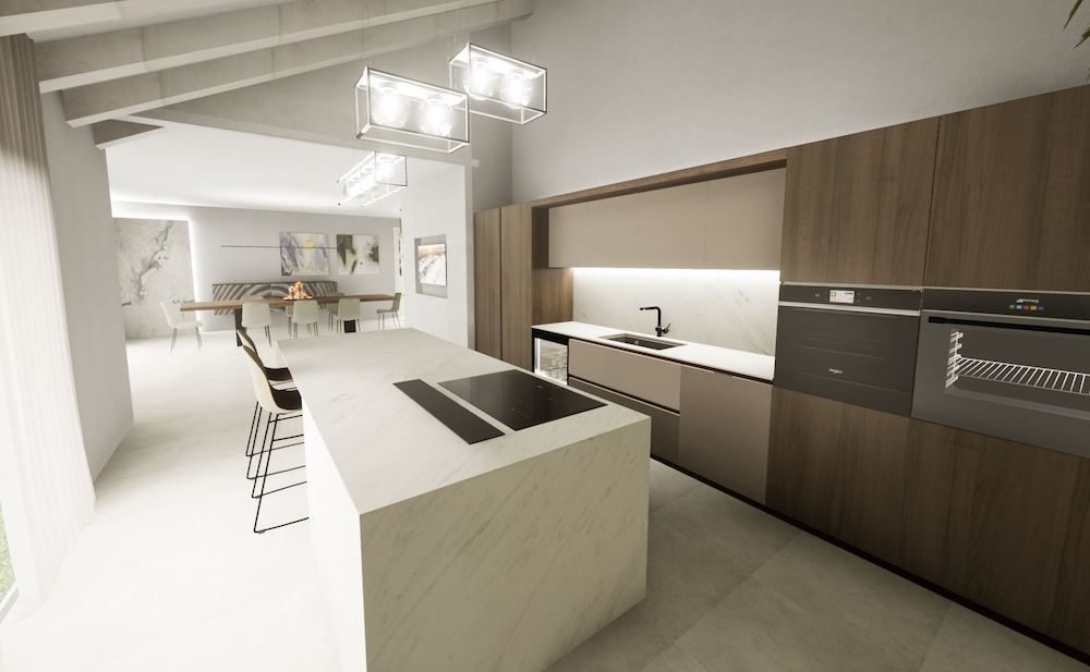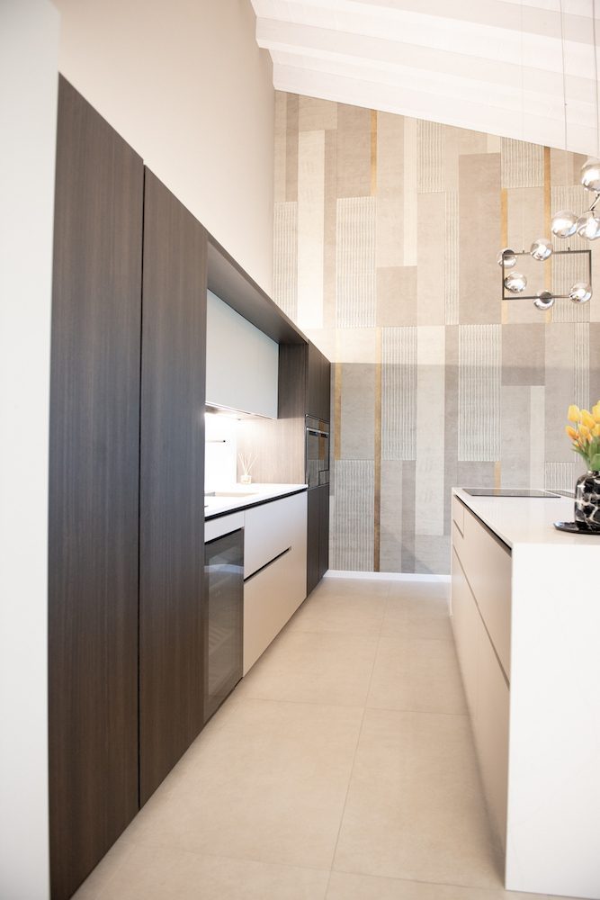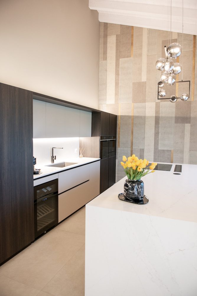 Per esaltare l’altezza dell’ambiente, un raggio luminoso si sviluppa da dietro il blocco cucina verso l’intera stanza, mentre la carta da parati, impreziosita da elementi dorati, inserisce un tocco di dinamismo.