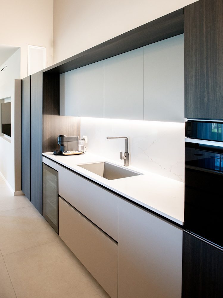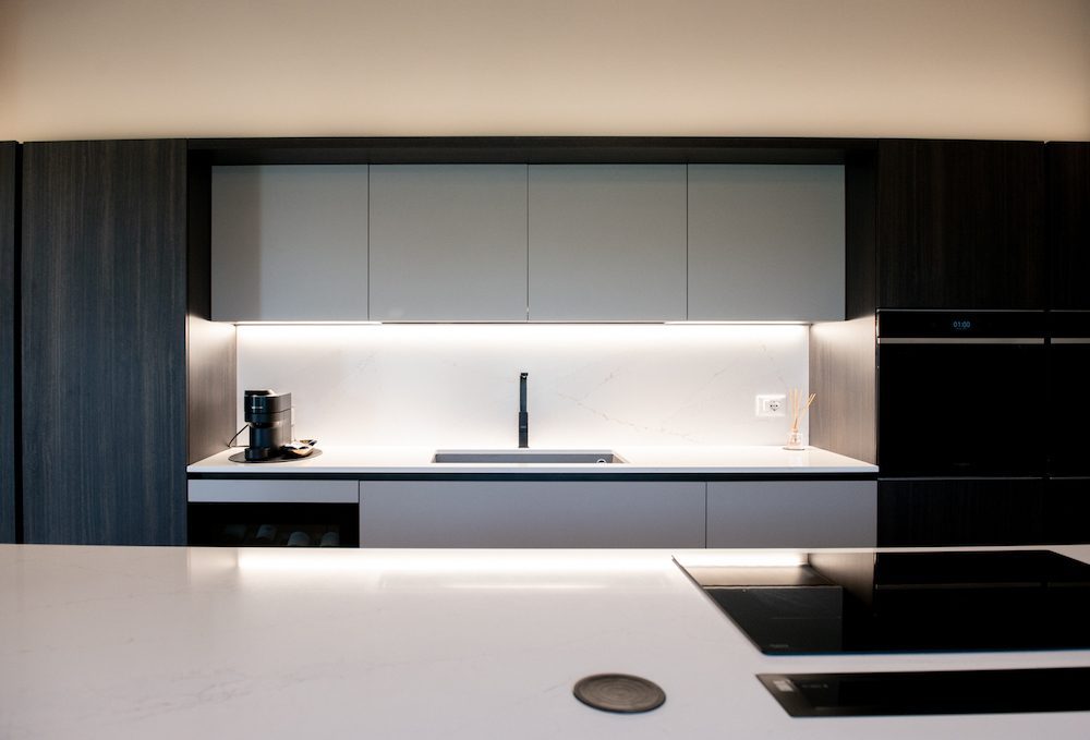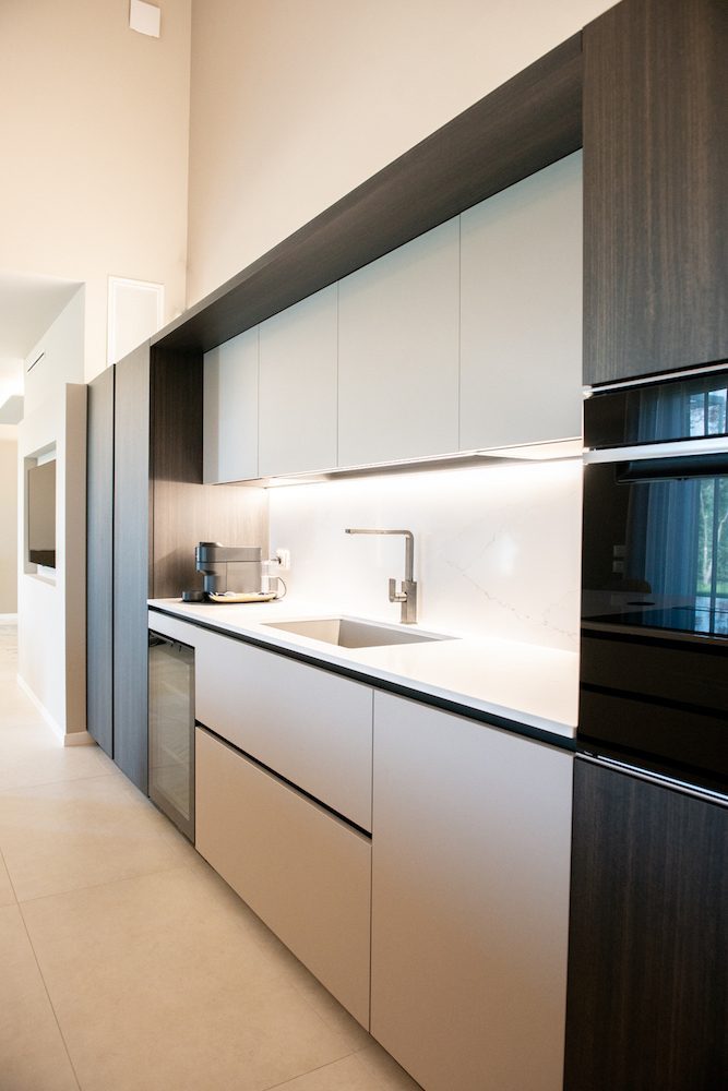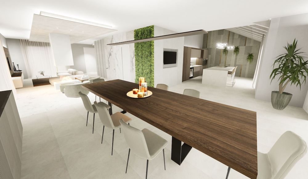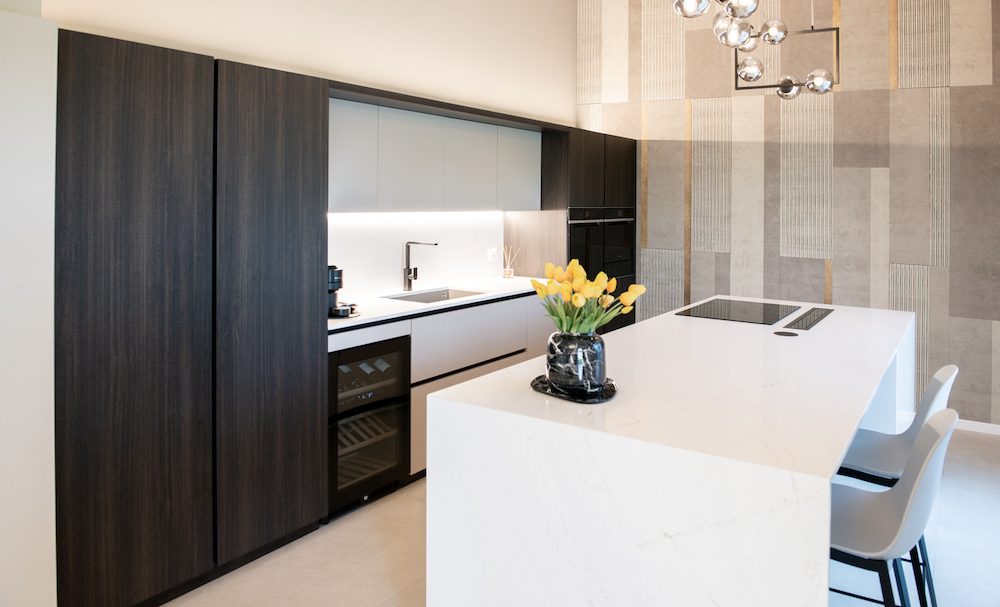 Per esaltare l’altezza dell’ambiente, un raggio luminoso si sviluppa da dietro il blocco cucina verso l’intera stanza, mentre la carta da parati, impreziosita da elementi dorati, inserisce un tocco di dinamismo.