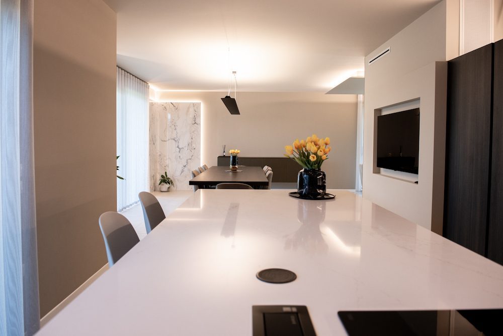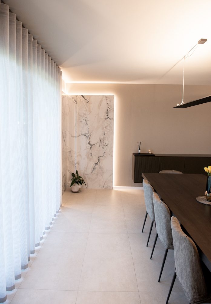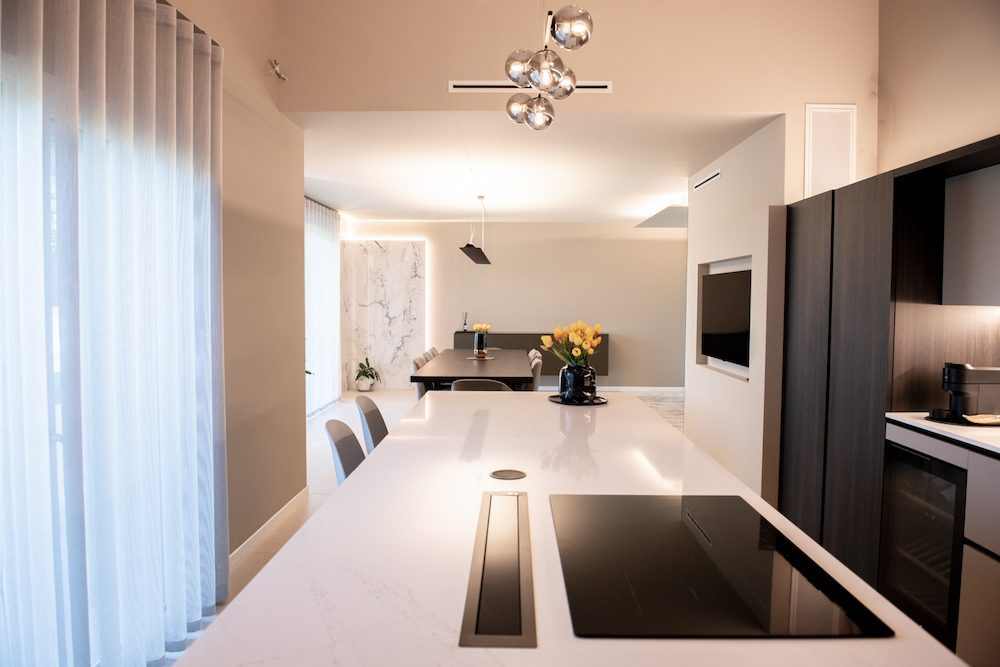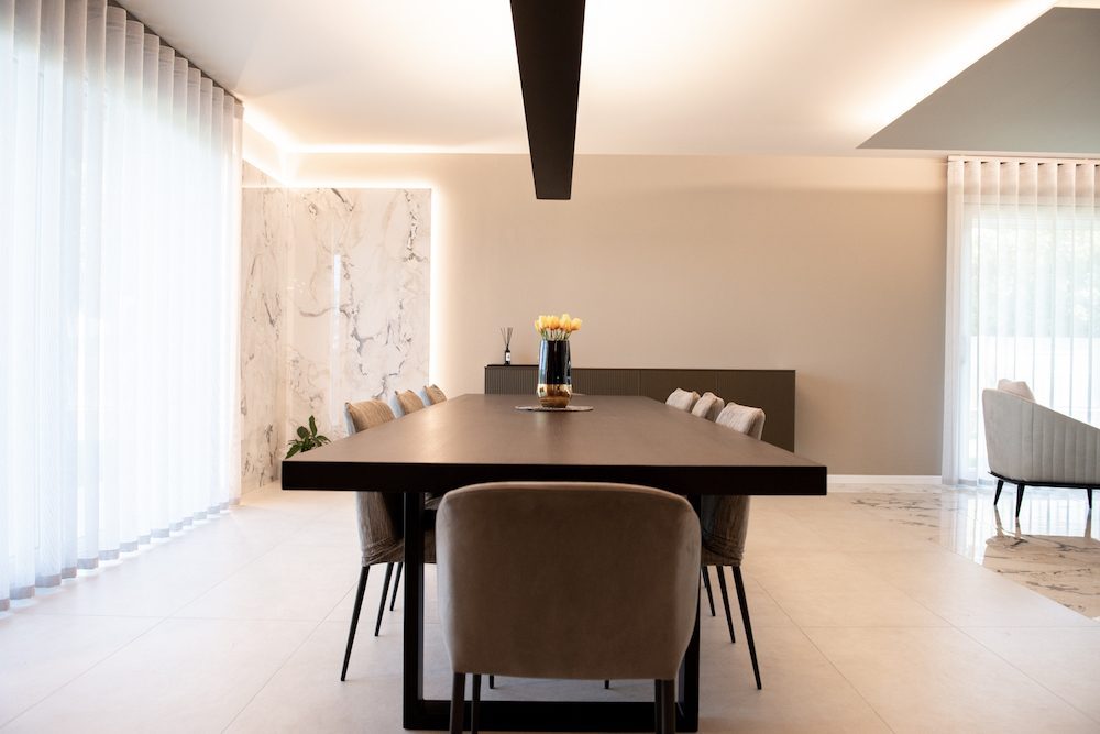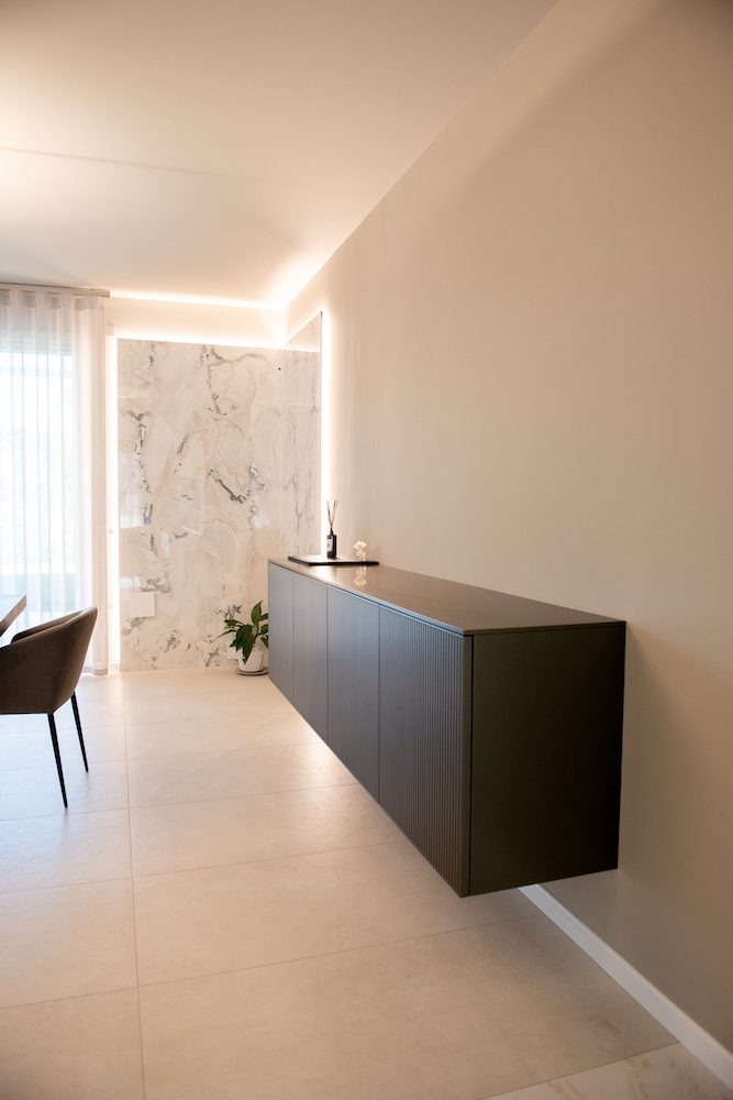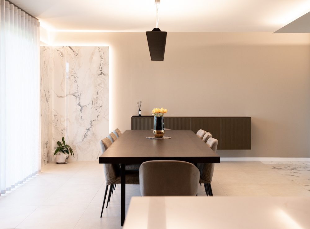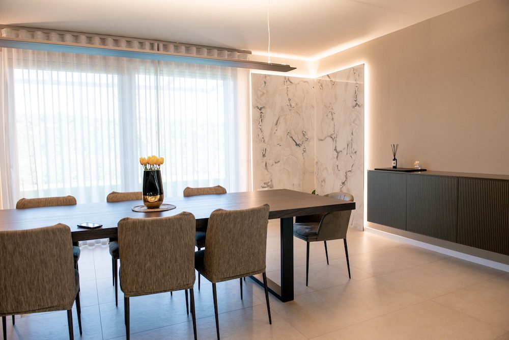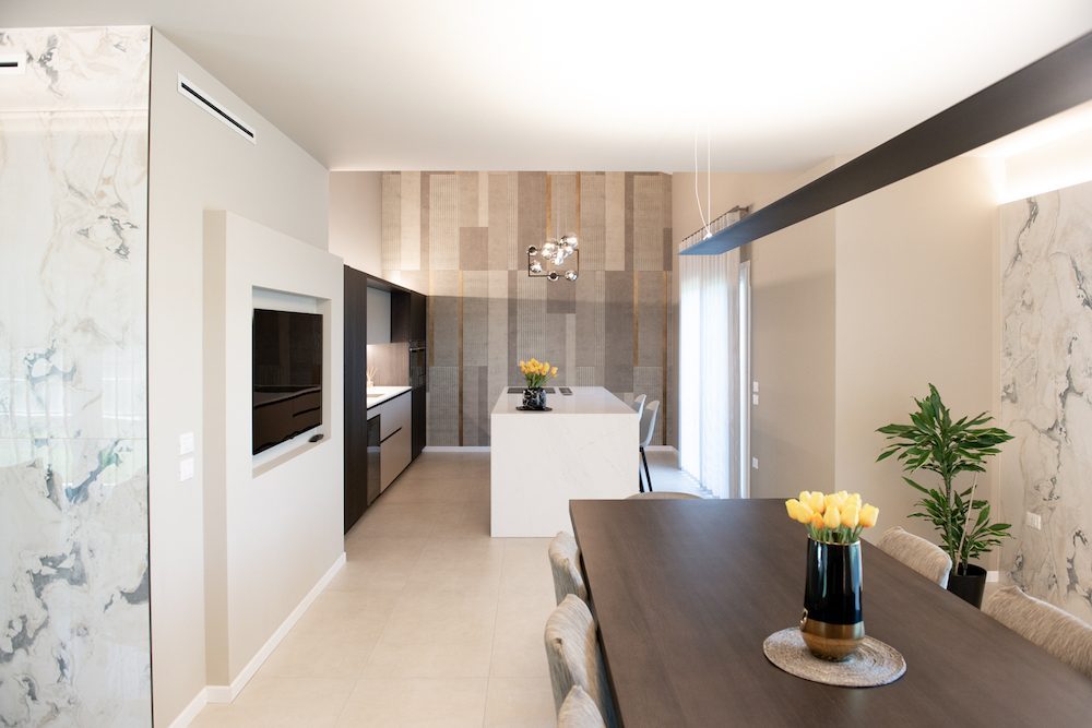 L’arredamento della zona pranzo crea una gradevole continuità tra area living e cucina. Qui ritroviamo una scenografia angolare, esaltata dalla luce, che riprende l’effetto marmo dell’area vicina. In piacevole contrasto, il tavolo in rovere e la madia cannettata richiamano colori e materiali che ritroveremo nella cucina. Sopra il tavolo, la lampada direziona la luce verso il soffitto, creando una delicata illuminazione diffusa. Proprio sul confine tra cucina e zona pranzo, un televisore inserito nella nicchia in cartongesso serve da intrattenimento per entrambe le zone.