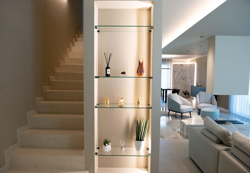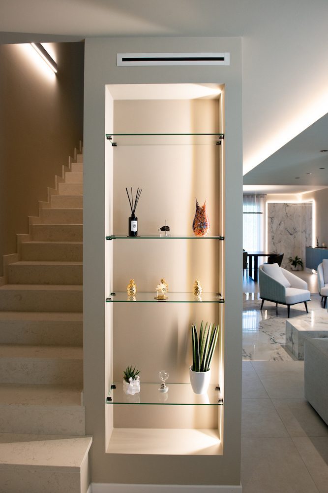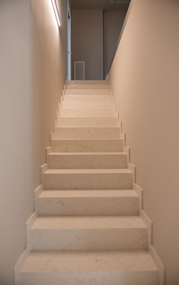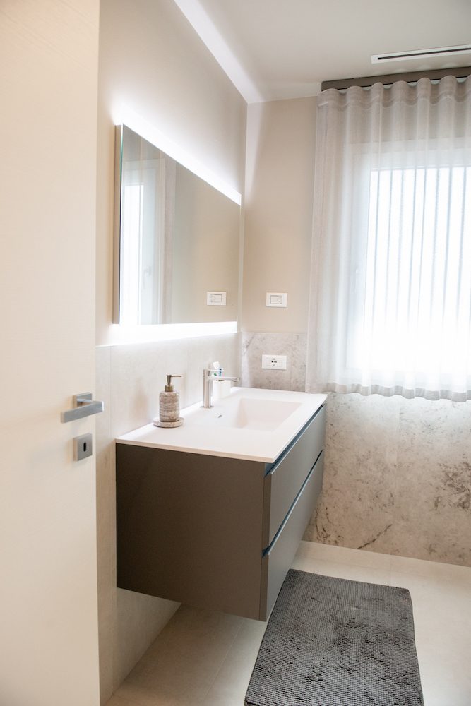 Ancora prima di terminare i gradini della scala che, dall’ingresso, conduce alla zona notte, è facile notare la “L” luminosa che percorre il corridoio dall’alto e che guida verso camere da letto. Un ambiente minimale e dai colori neutri accoglie chi sale, e predispone al riposo.