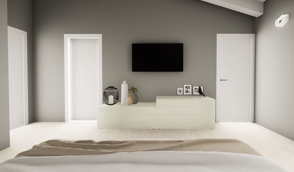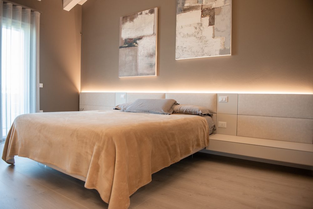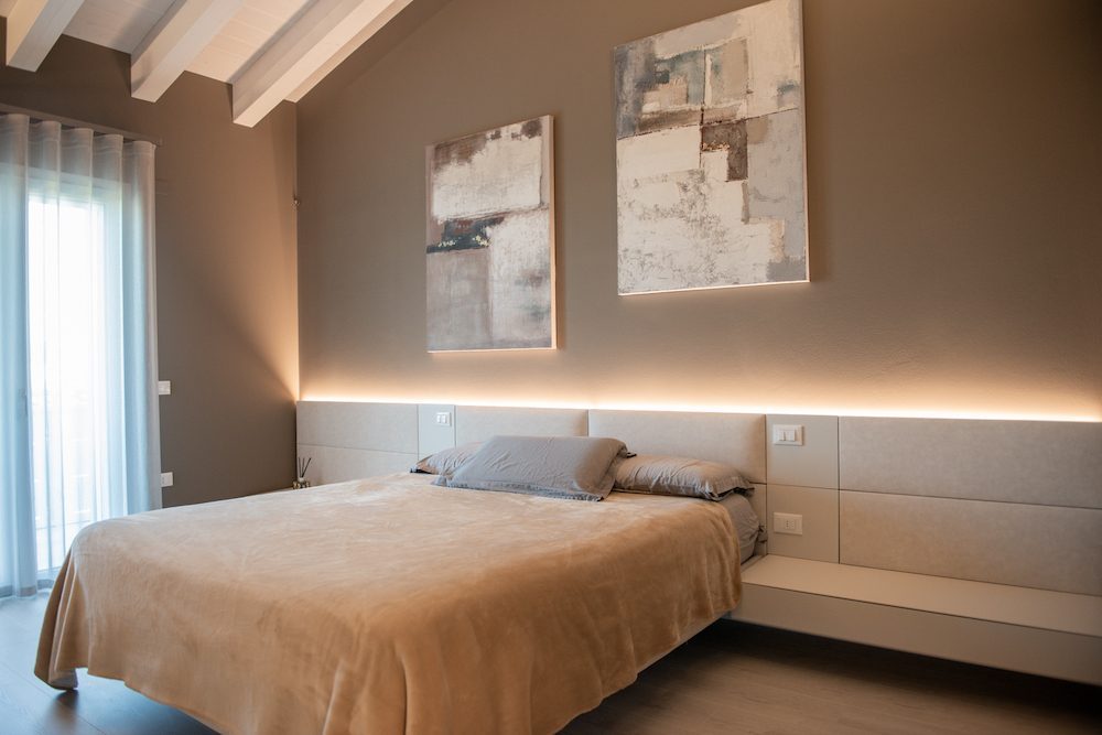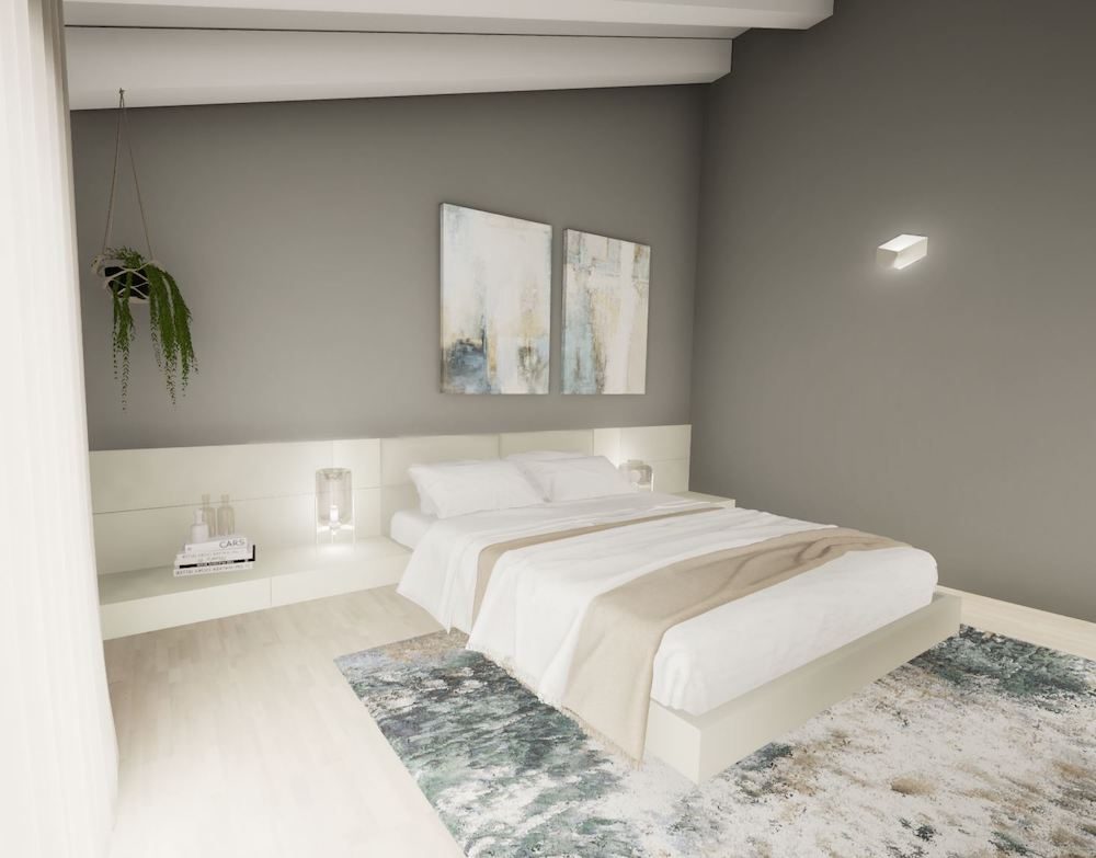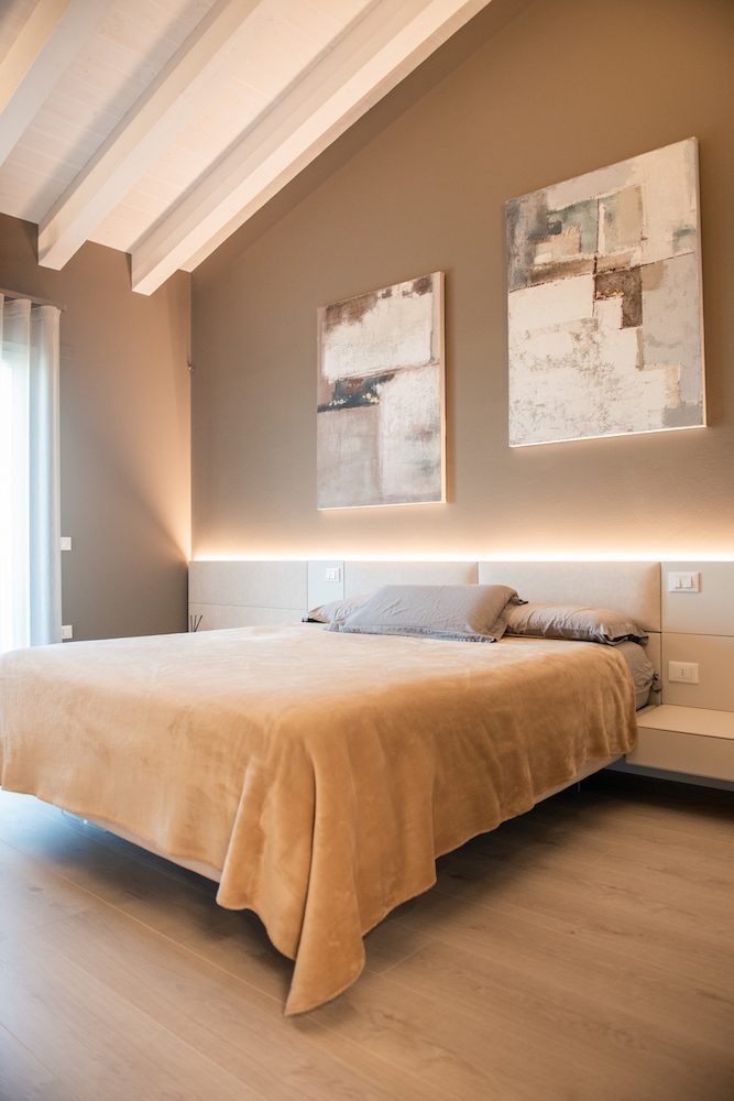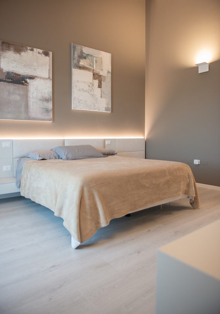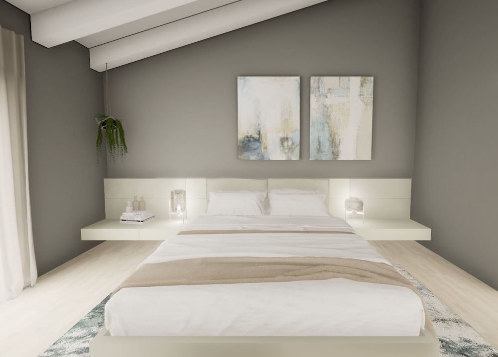 Il letto, solo apparentemente sospeso, trasmette un senso di leggerezza e al contempo accoglienza, anche grazie ai colori neutri che si legano in armonia all’interno della stanza, dalle pareti al parquet. La boiserie imbottita in ecopelle retroilluminata contribuisce a donare eleganza e piacevolezza all’ambiente.