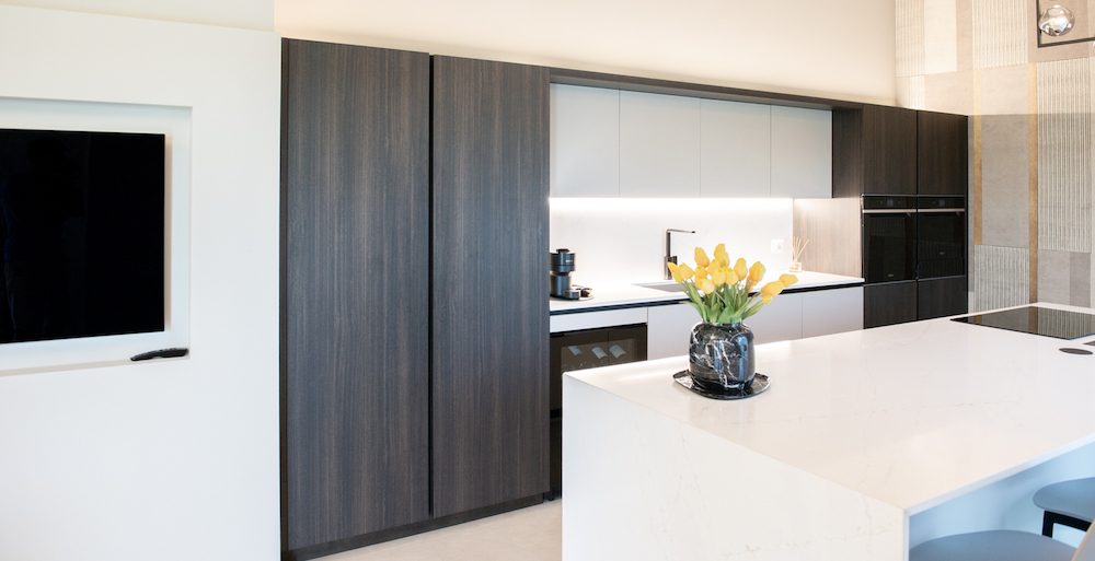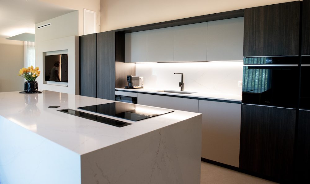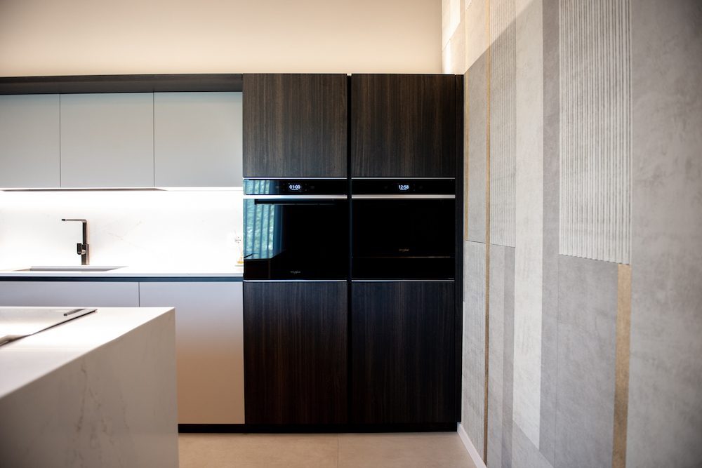 Accanto alla zona pranzo, preclusa alla vista dall’area living, si sviluppa la cucina, arredata da un’ampia isola effetto marmo. Il rovere termotrattato, che caratterizza colonne e antine del blocco cucina, crea un elegante contrasto con gli elementi più chiari che lo accompagnano.