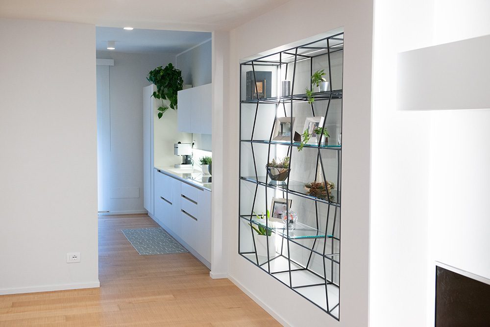 Accanto alla libreria, gli elementi geometrici del soggiorno si rincorrono in un gioco di forme e luci che, ancora una volta, affascina e conquista.