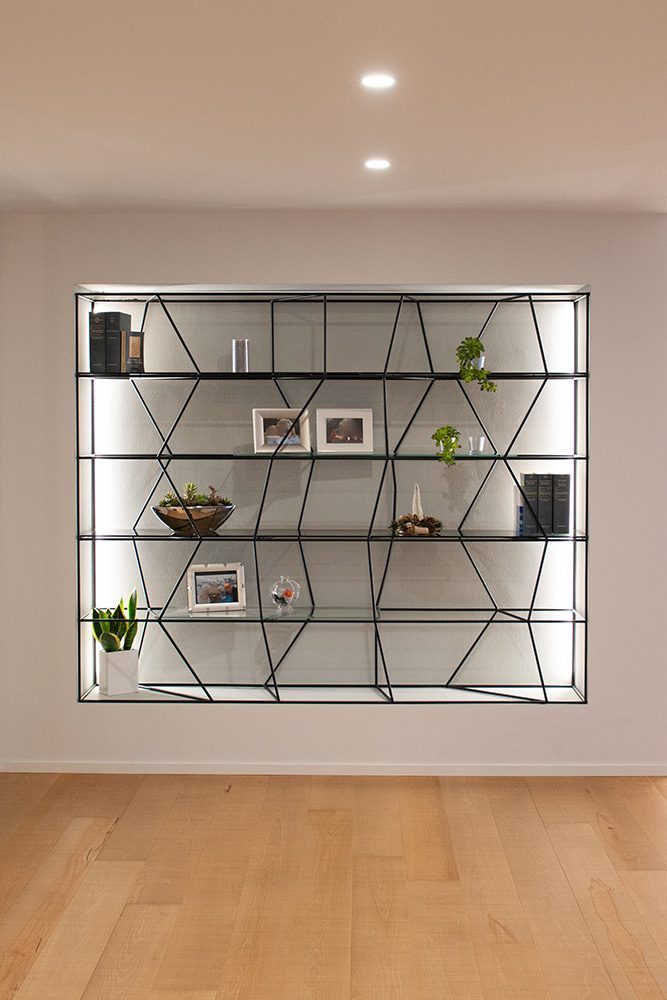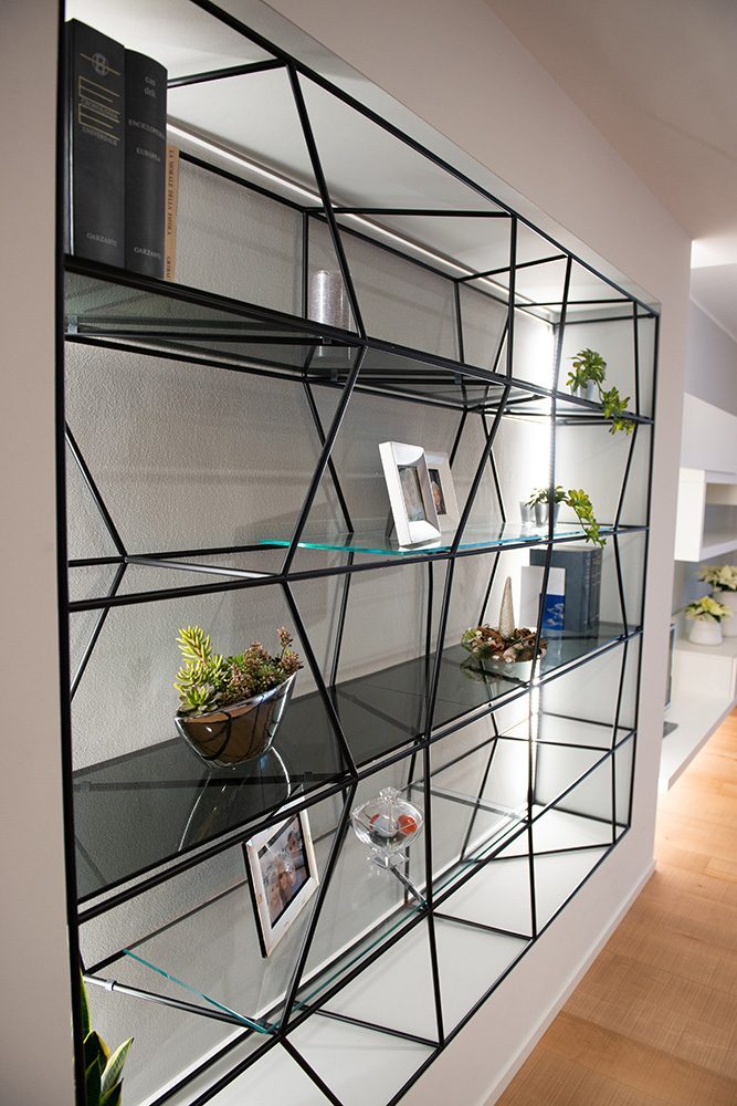 Originale e sofisticata, la libreria si pone come oggetto di design dalla forte personalità. La luce gioca con le linee e le forme, accrescendone il fascino.