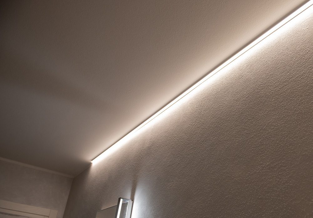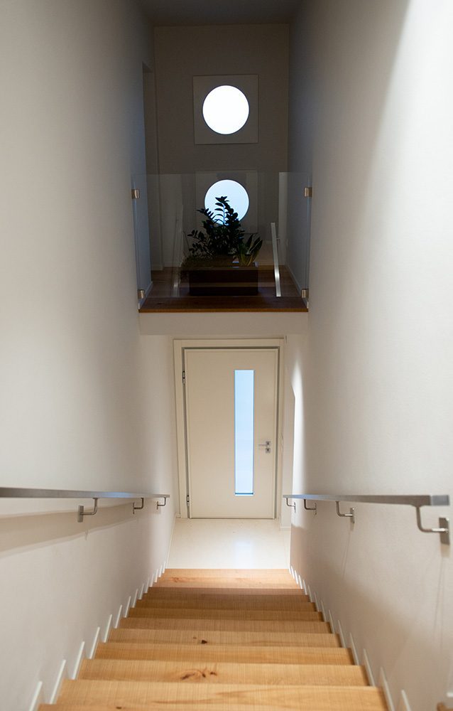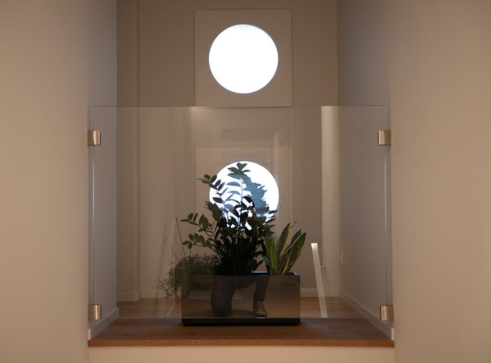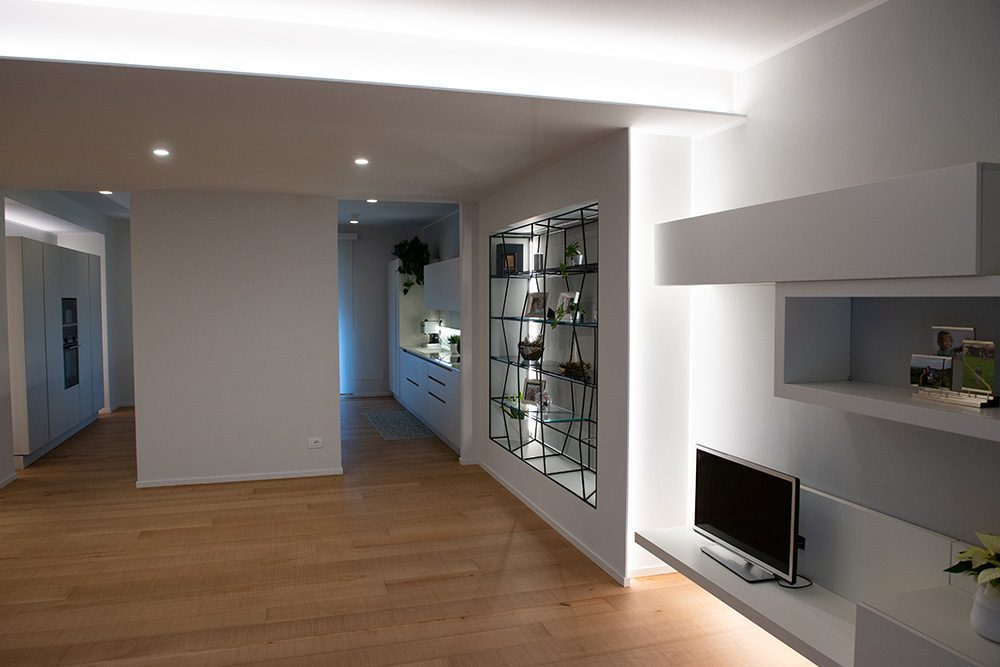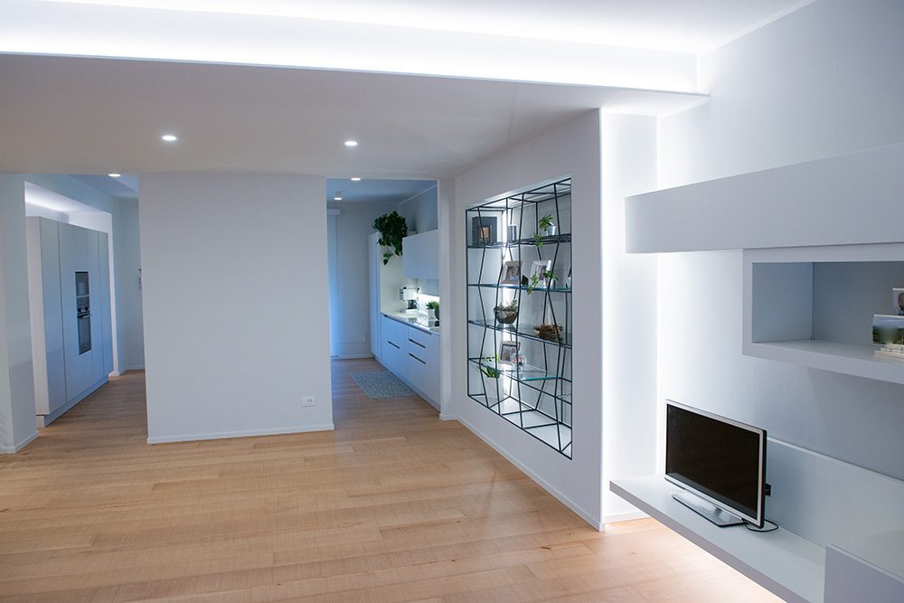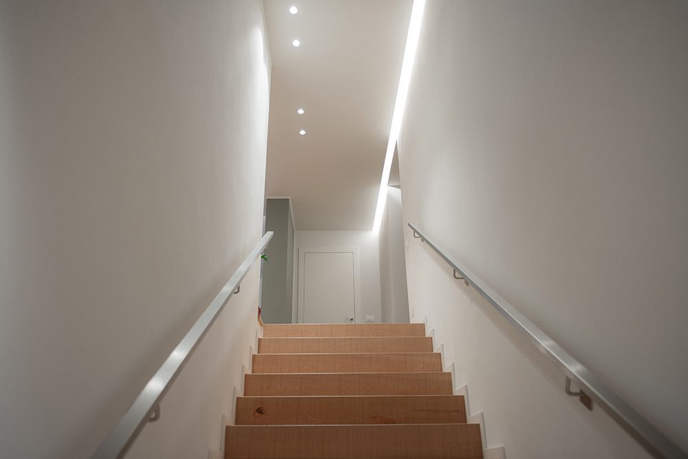 Subito la luce s’impone come protagonista e, al contempo, elemento funzionale alla valorizzazione dello spazio pulito, elegante, minimale della zona giorno. Un taglio di luce conduce dalla scala alla zona living, mentre i faretti del controsoffitto offrono un’illuminazione che discretamente conduce verso la cucina, creando continuità estetica, e verso la libreria, vero elemento capace di catturare lo sguardo.