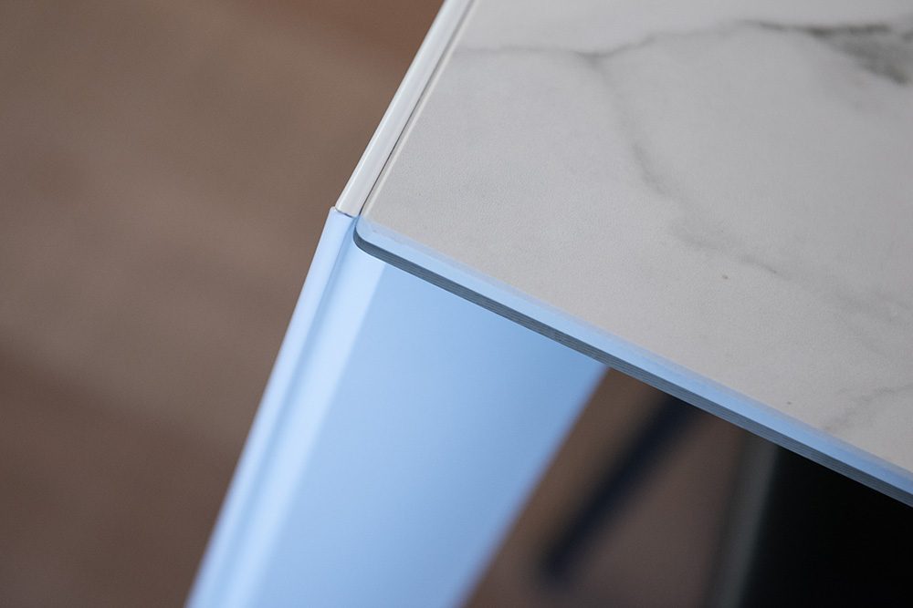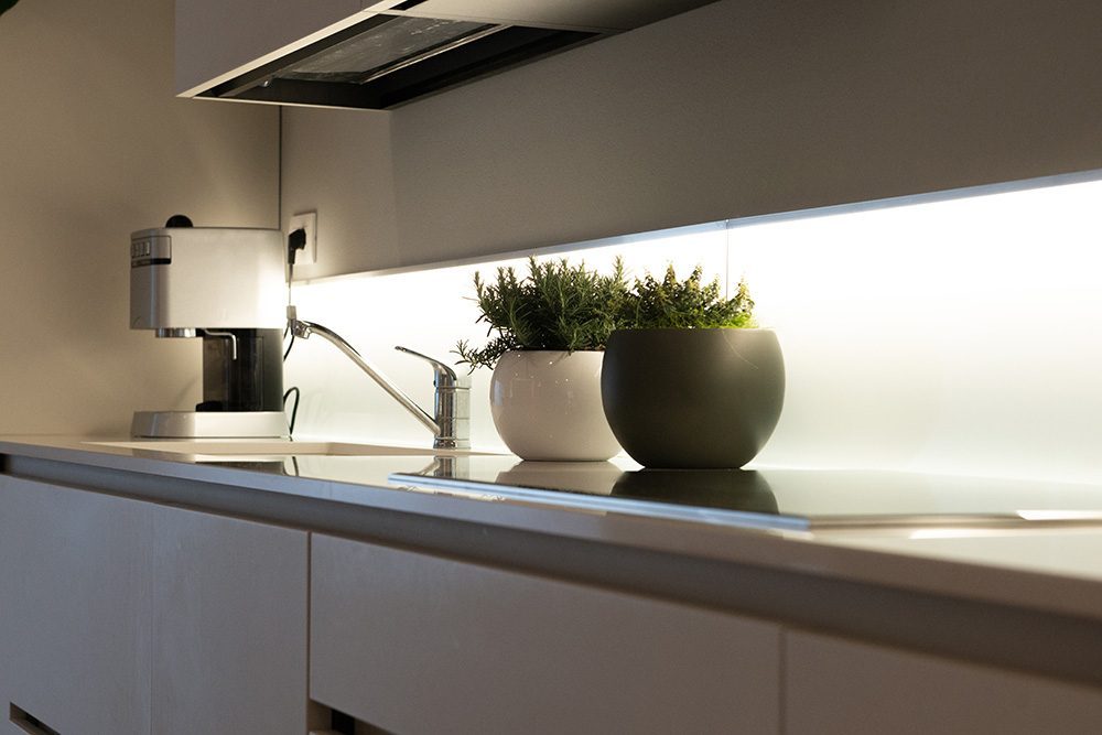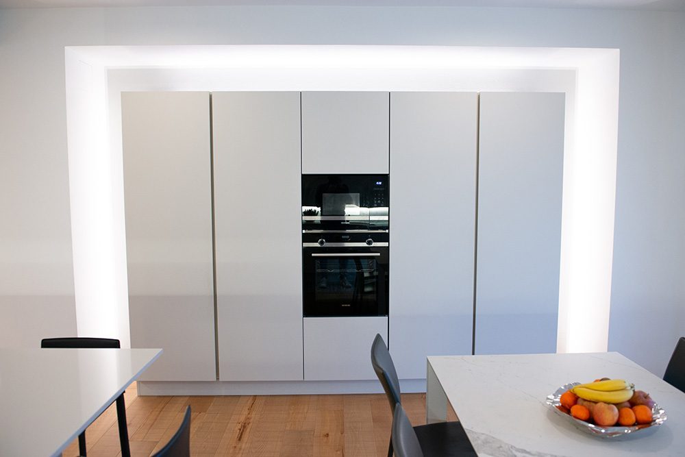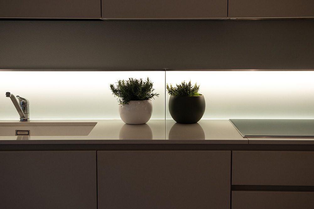 In cucina, la schiena retroilluminata in vetro illumina il piano di lavoro in quarzo e si riflette sulle superfici lucide riproponendo l’effetto scenografico che domina nell’intera zona giorno dell’appartamento moderno, rendendo prezioso anche l’elemento più essenziale.