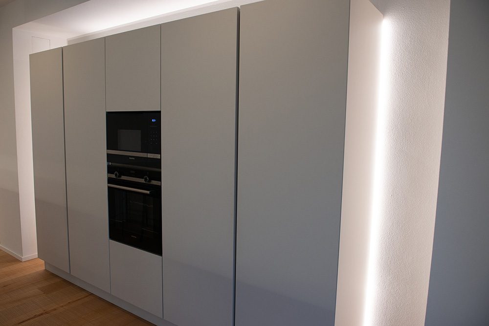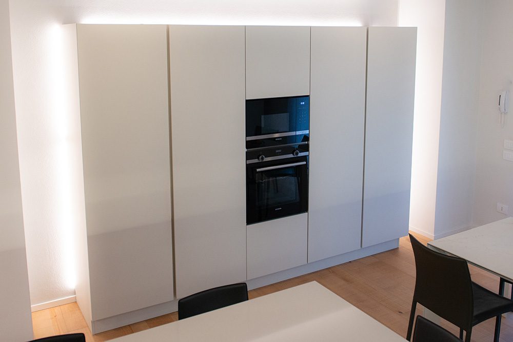 Di fronte al piano di lavoro, una seconda parete attrezzata ospita elementi contenitori ed elettrodomestici, per garantire massima funzionalità in un design contemporaneo e minimale.