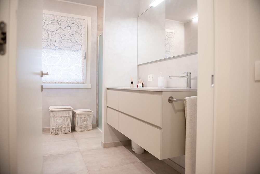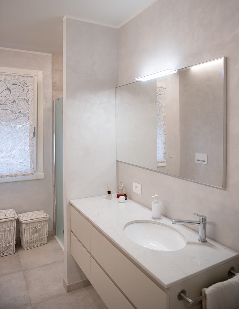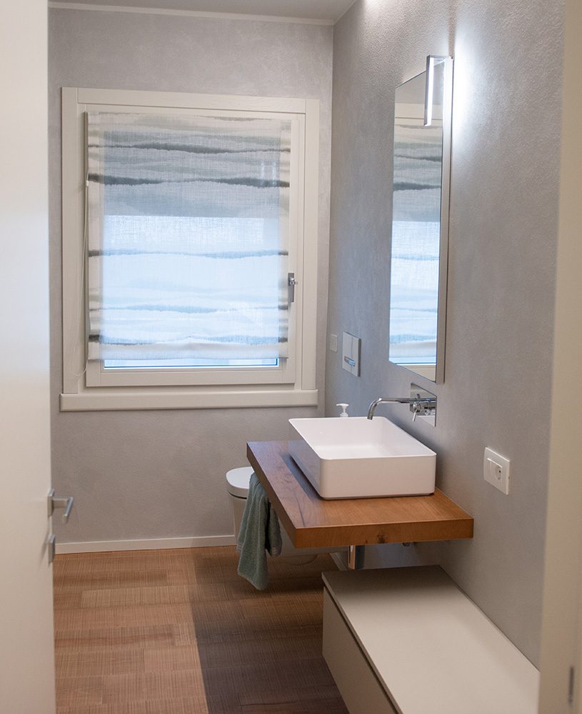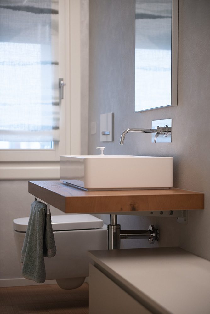 Elementi sospesi da terra con tagli orizzontali rendono unica, elegante e di carattere anche la zona bagno. Un ampio specchio verticale e un lavabo a bacinella definiscono invece l’estetica del secondo bagno.