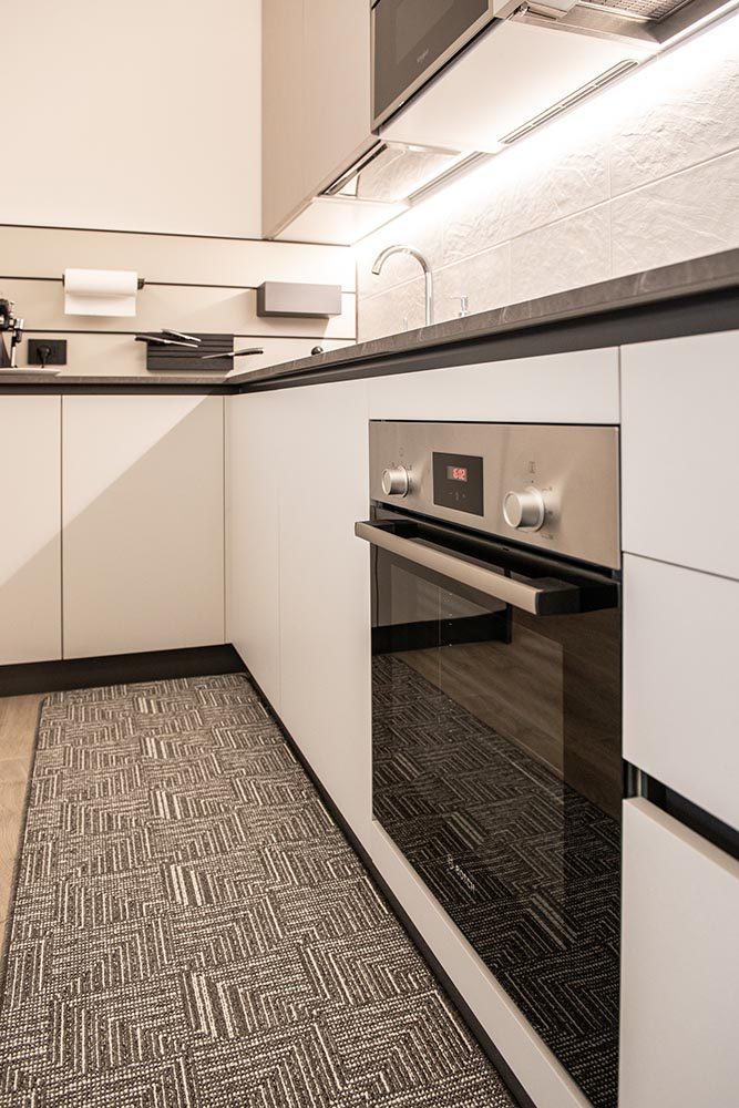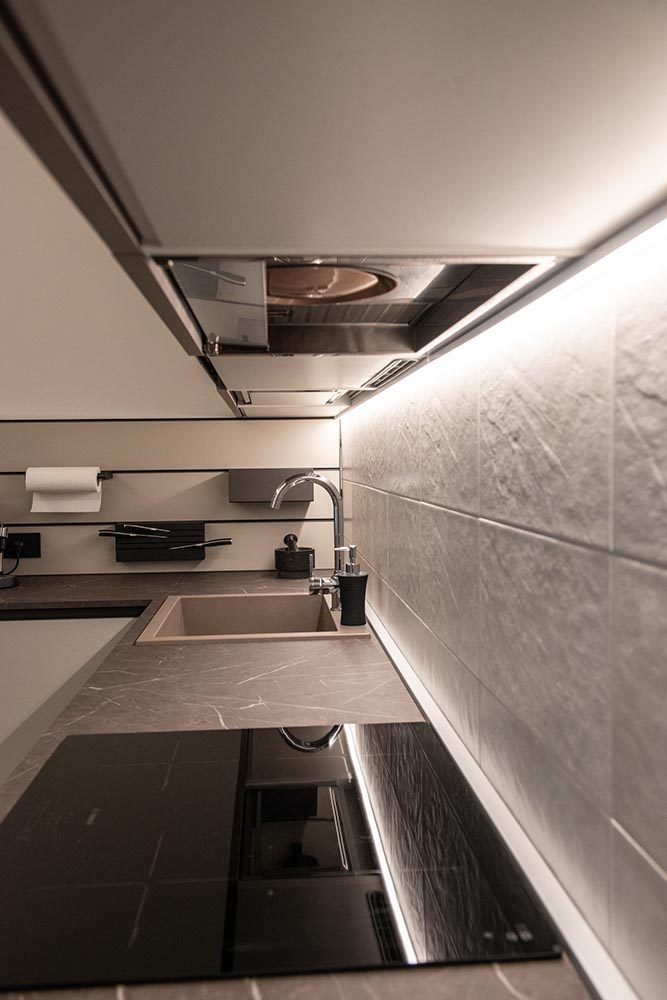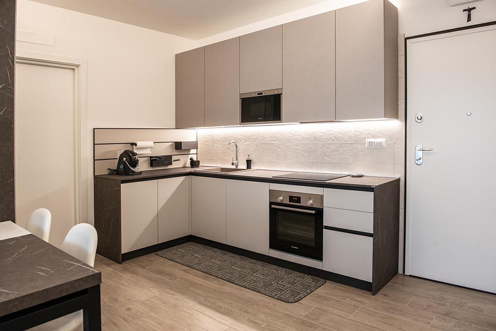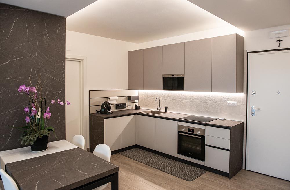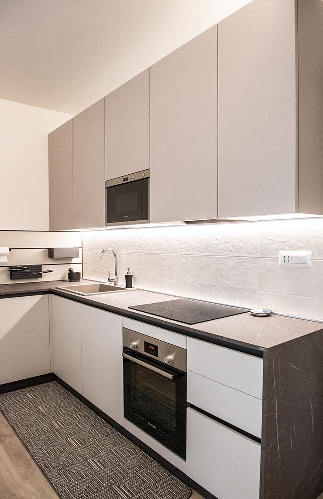 Il top della cucina, dello stesso colore del tavolo divisorio tra soggiorno e cucina, si sposa con i toni più chiari dei pensili, alti per poter sfruttare appieno lo spazio verticale dell’appartamento.