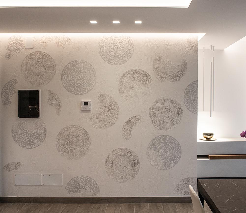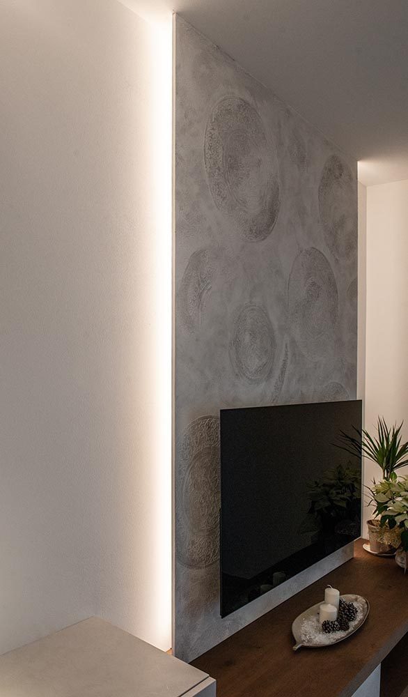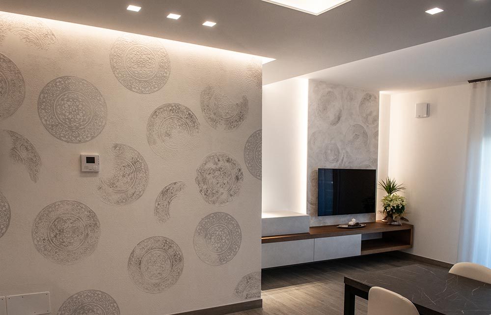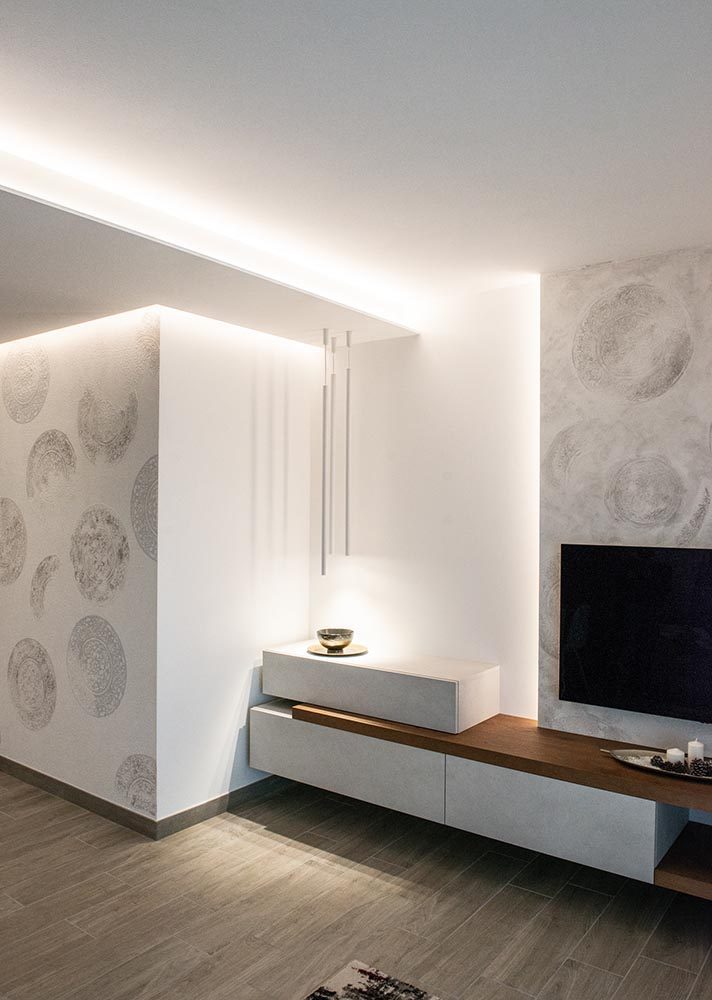 Una parete in cartongesso permette di creare una raffinata area che valorizza il televisore all’interno del soggiorno, offrendo così la possibilità di appendere il televisore, nascondendo alla vista i cavi. L’elegante motivo della parete in cartongesso crea continuità con l’ampia parete decorata che valorizza l’ingresso della casa. L’illuminazione valorizza piccoli dettagli, che risaltano come gioielli.