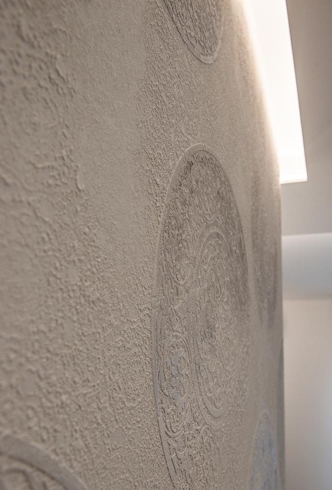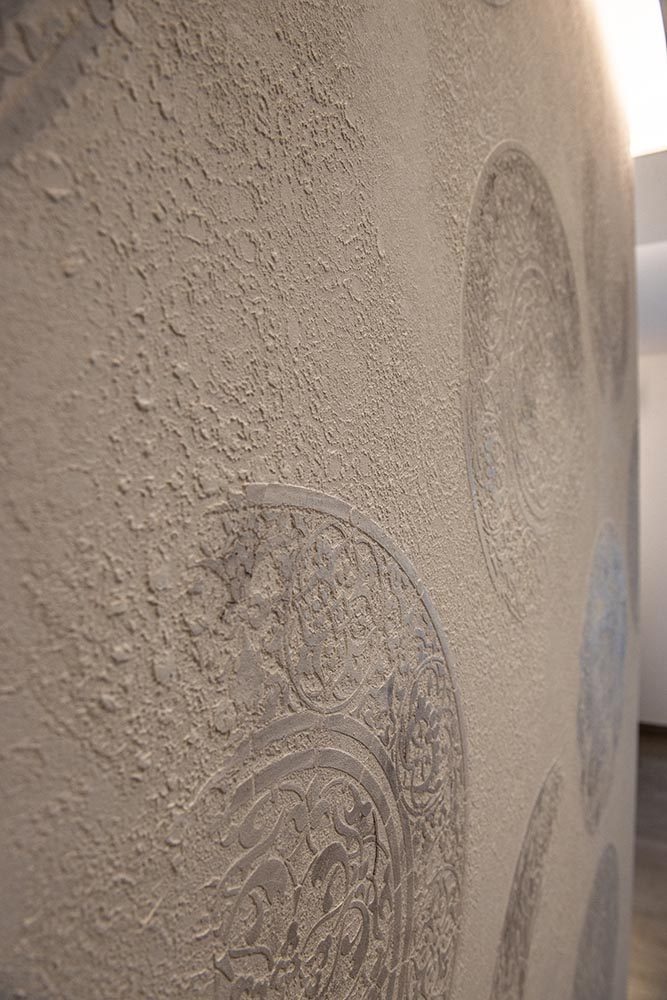 La parete che delinea l’ingresso è la più caratteristica dell’intero open space, grazie alla finitura in calce cruda. Grazie alla possibilità di lavorare su più strati, la calce cruda permette di ottenere un effetto materico e tridimensionale, per una personalizzazione completa e un elegante incontro tra design e arte.
