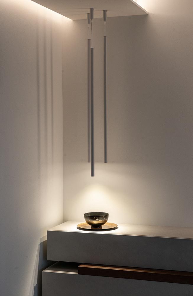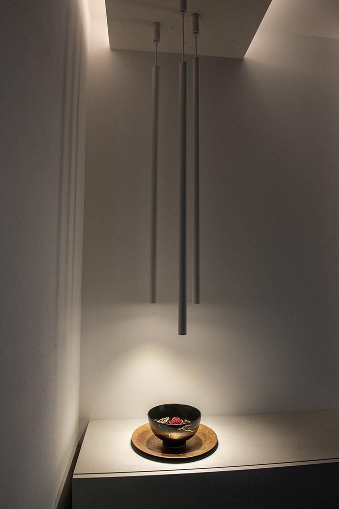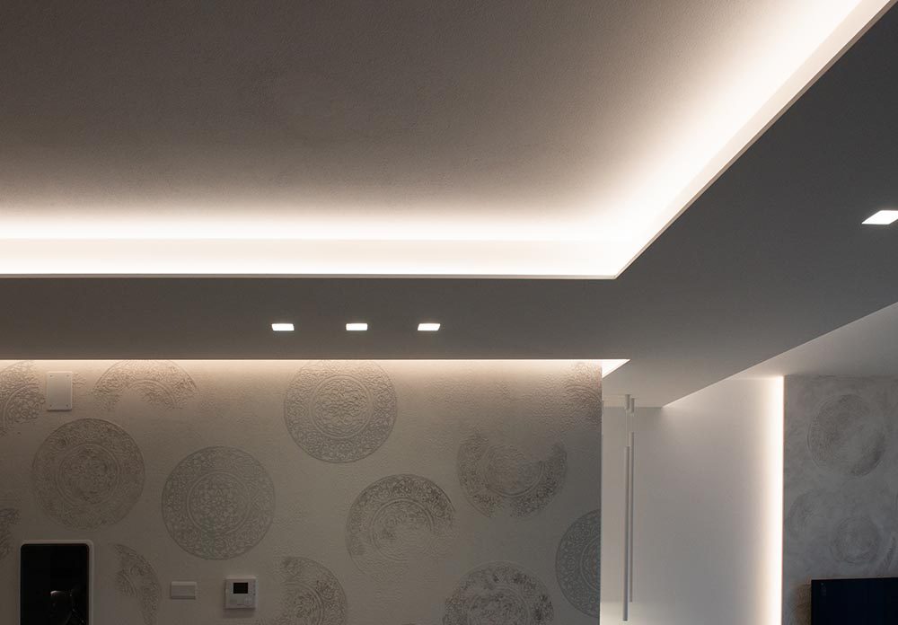 Il cartongesso del soffitto segue questa ideale divisione degli ambienti nella zona giorno open space, creando l’illusione di un ingresso separato, anche grazie ai punti luce che accennano alla presenza di un corridoio. In questo modo, nessun vincolo illuminotecnico viene imposto alla posizione del tavolo.