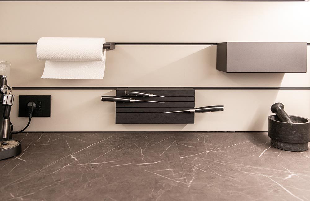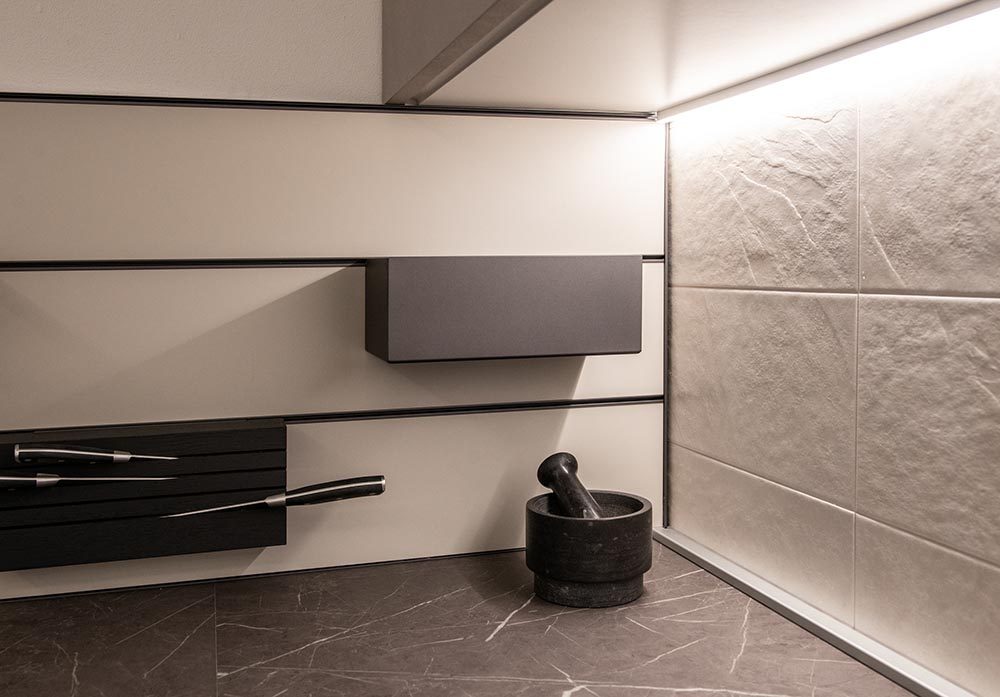 L’appartamento padovano imponeva qualche vincolo, trasformato dai nostri arredatori grazie al Sistema Abitativo® in risorsa per rendere la zona giorno open space unica, raffinata e dinamica. Un pilastro preesistente ha assunto nuova identità, divenendo una moderna e elegante libreria che crea una separazione tra zona cucina e zona living. Allo stesso tempo, riprendendo il piano del tavolo, crea continuità con la cucina e contribuisce a definire in modo armonico gli spazi dell’open space.