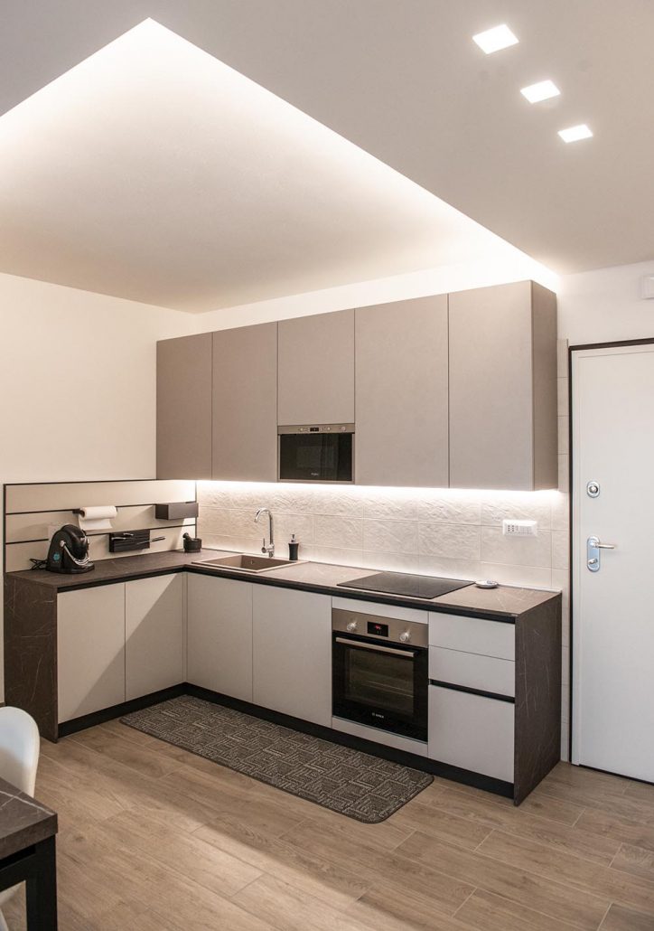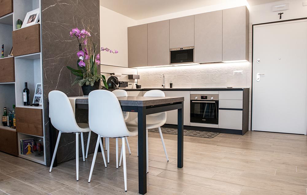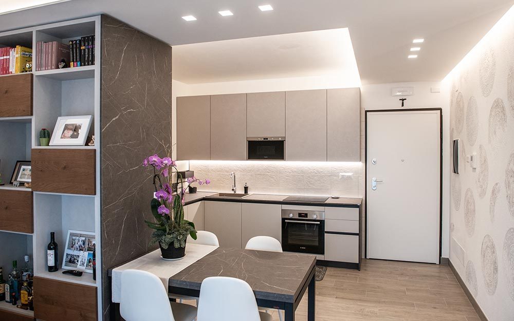 In questo modo, la cucina e il soggiorno possono godere della giusta privacy, senza rinunce dal punto di vista dell’illuminazione naturale