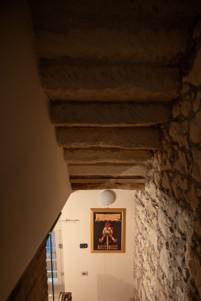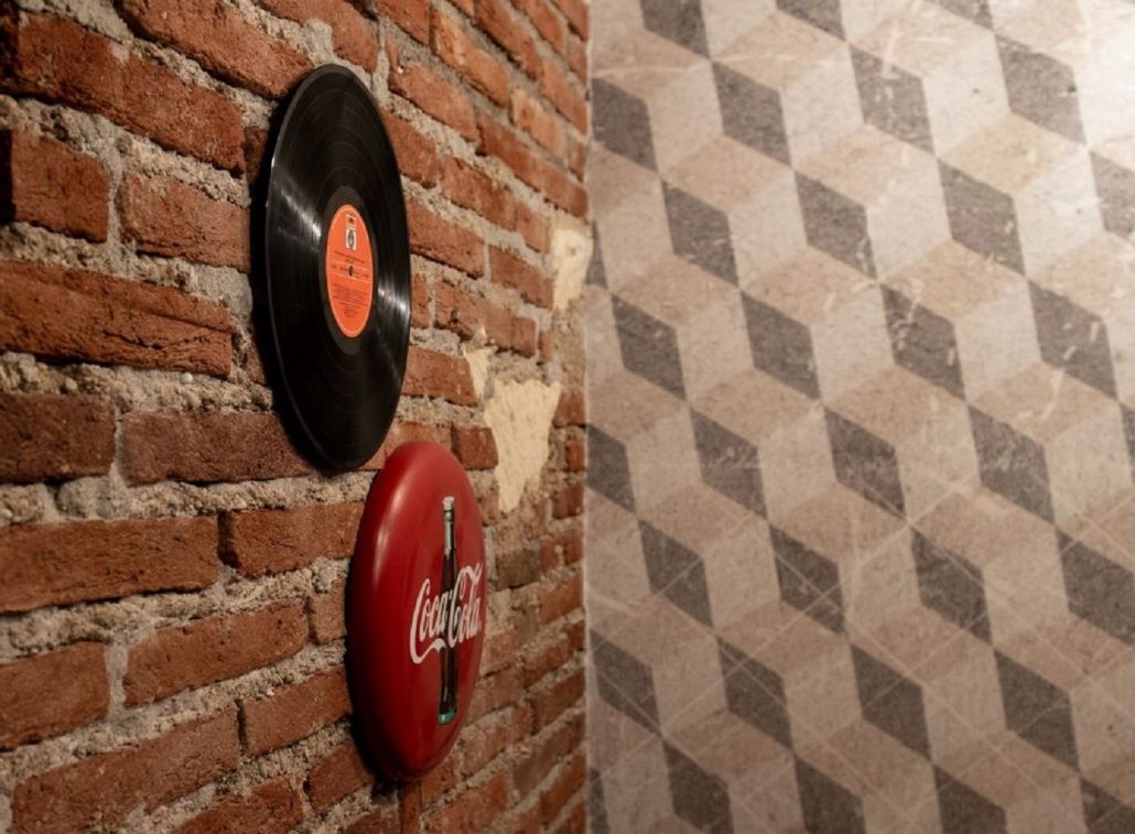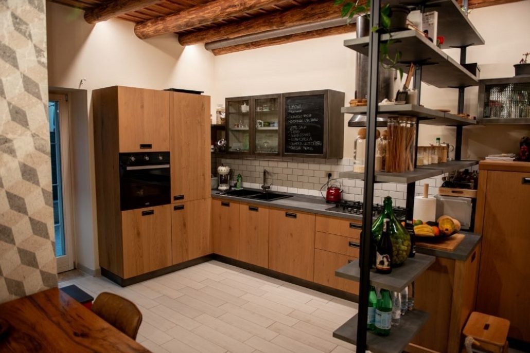 Le travi in legno sovrastanti creano una cornice rustica e tradizionale, che enfatizza il contrasto tra i dettagli retrò e gli arredi più moderni.