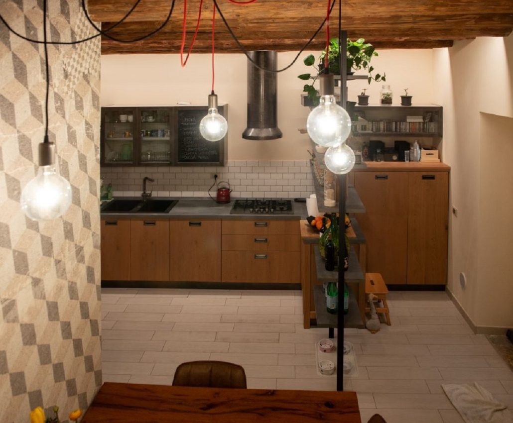 In alto l’illuminazione è garantita da un lampadario con cavi a vista che ben si sposa con lo stile industriale circostante.