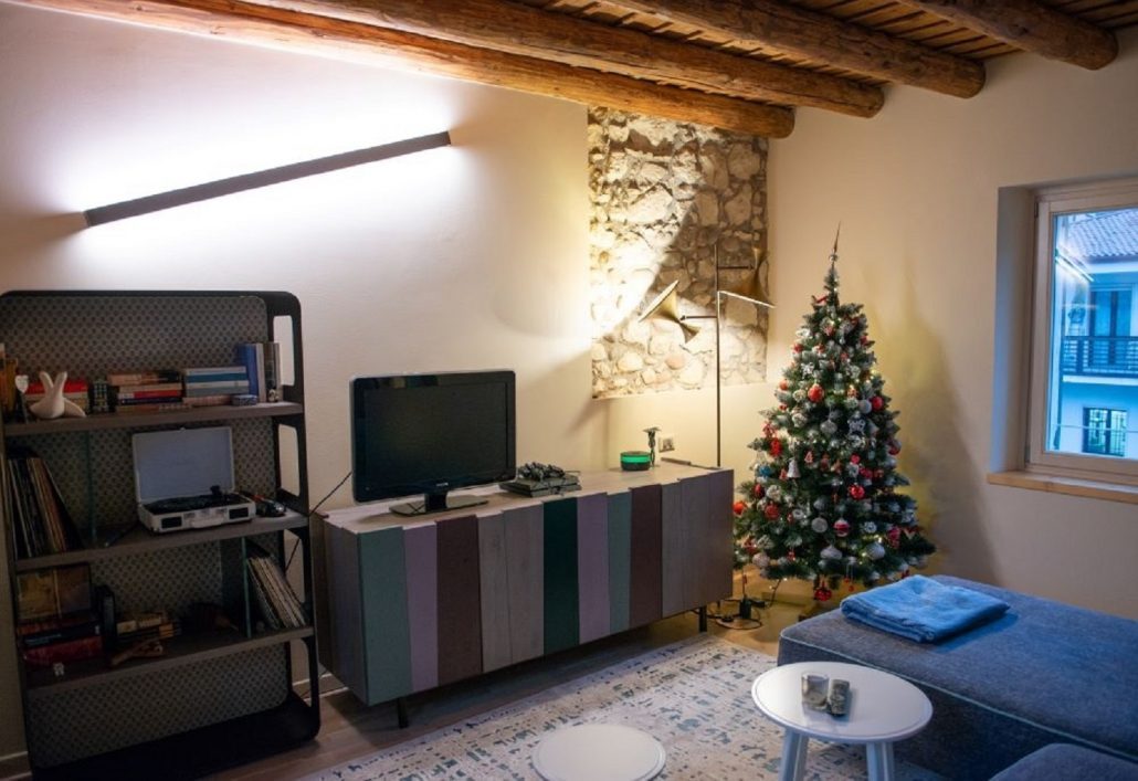 Il divano con lo schienale girevole diventa un comodo letto matrimoniale, trasformando la stanza in una confortevole camera per gli ospiti, con porte scorrevoli e zona TV.