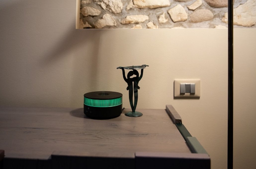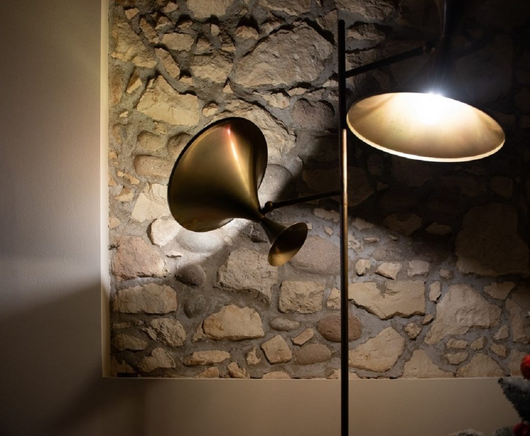 Le lampade che si riflettono sulle travi regalano un’atmosfera rilassante e soffusa, avvolgendoci con interessanti giochi di luci e ombre.