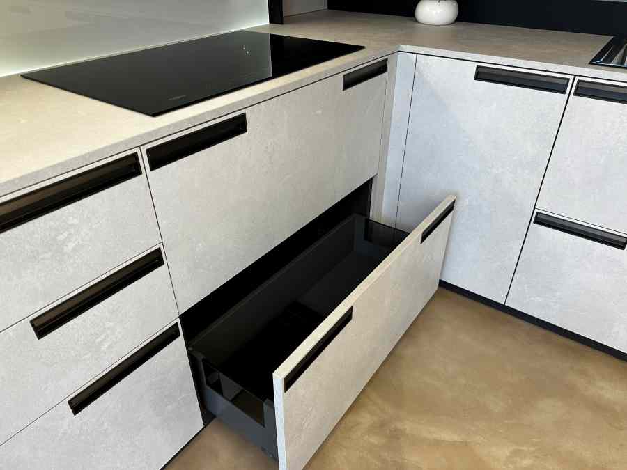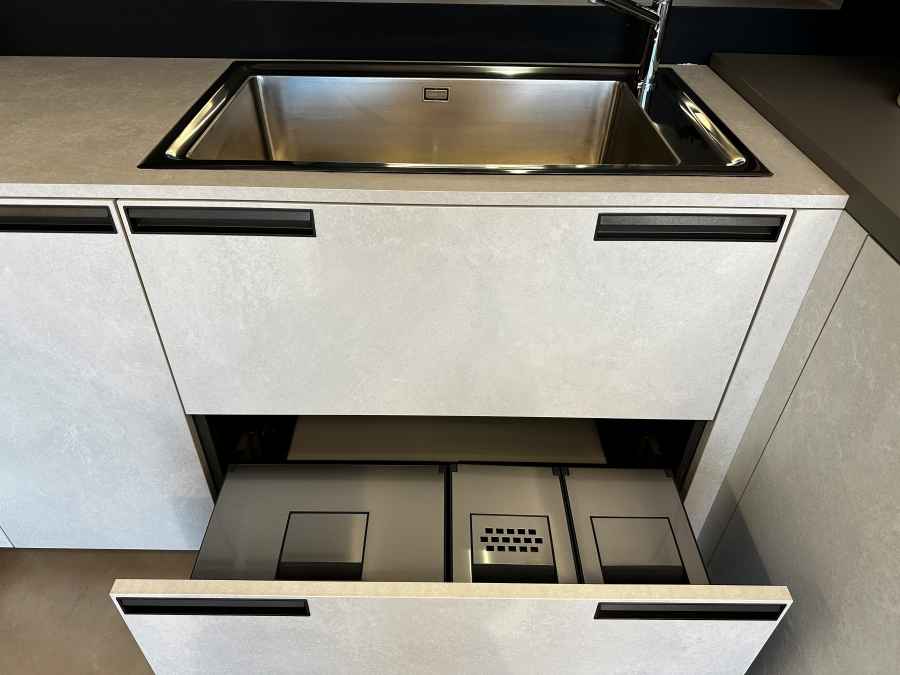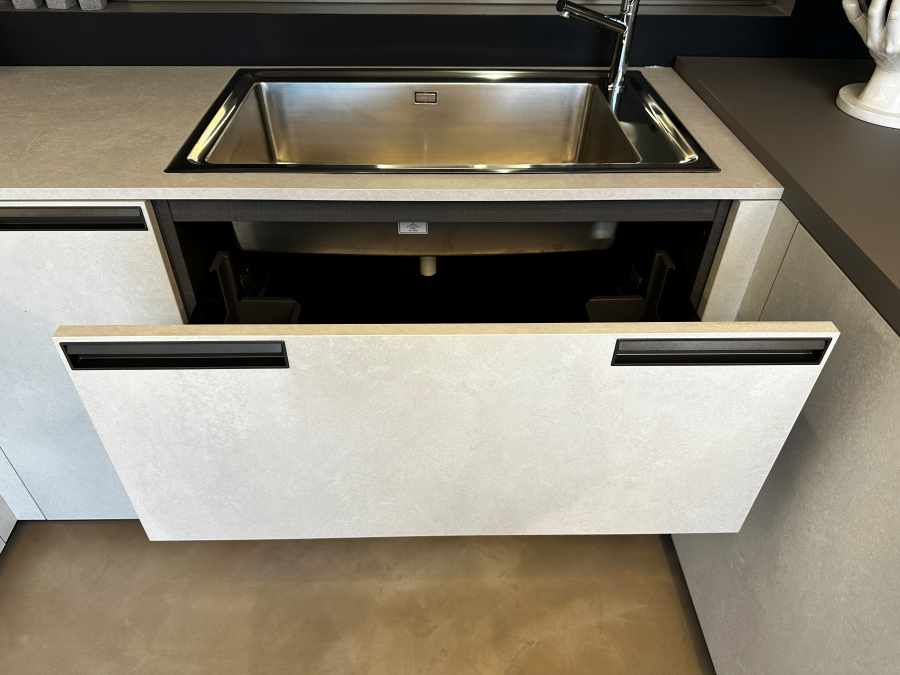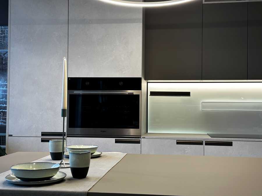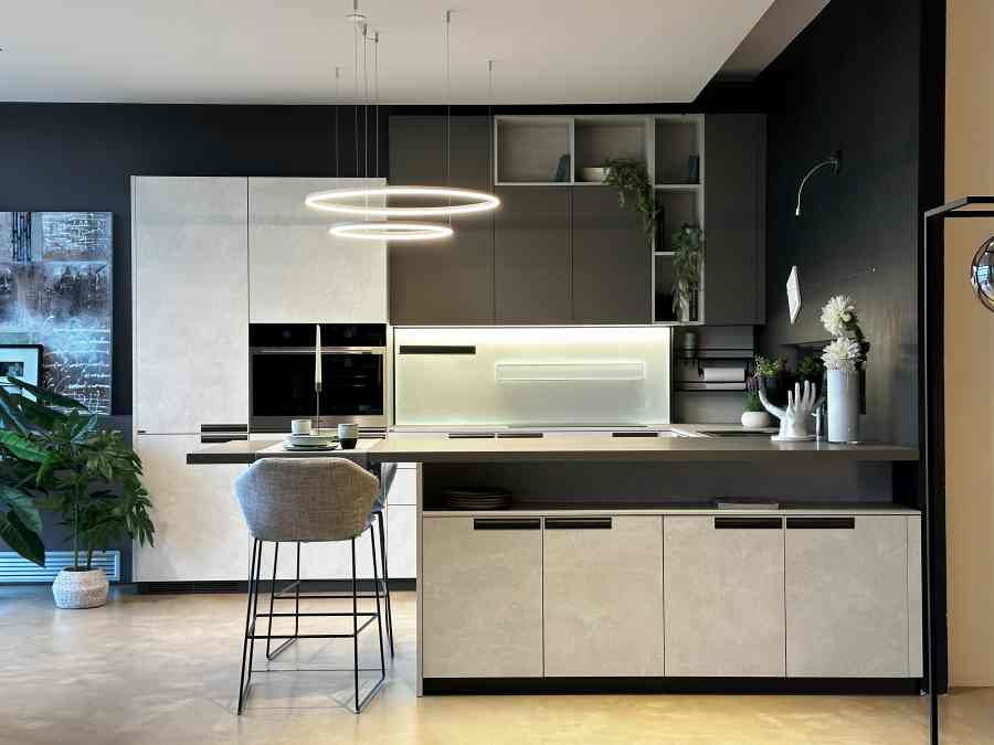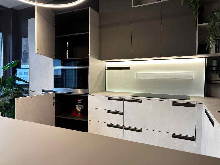 Le ante in melaminico decorativo pietra solar conferiscono un aspetto moderno e sofisticato, mentre il top in Fenix grigio Londra, spesso 6 cm sulla penisola, aggiunge un tocco di eleganza e resistenza. Le maniglie a incasso completano il design minimalista, garantendo una linea pulita e continua.
