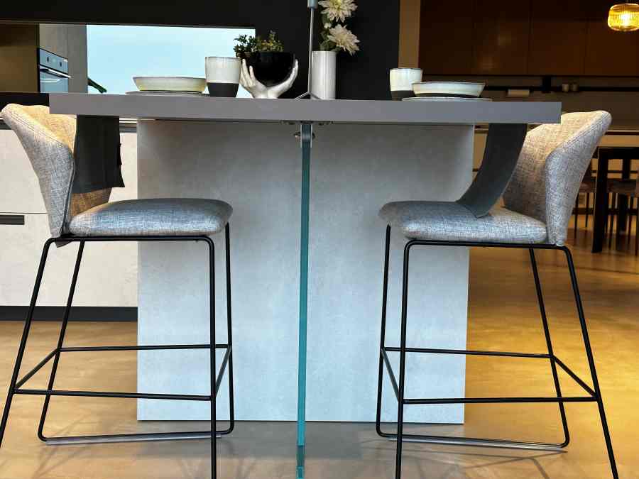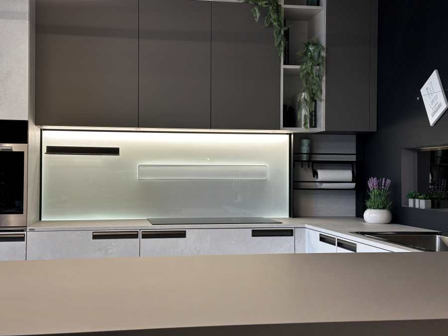 - Top: Fenix grigio sp.6 cm sulla penisola e melaminico pietra solar sp.2cm a muro