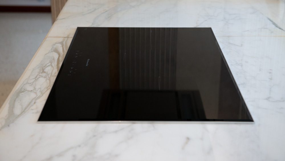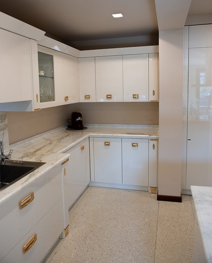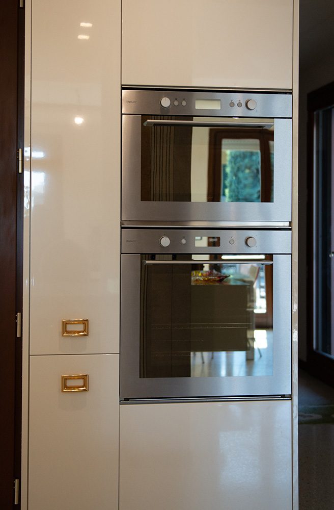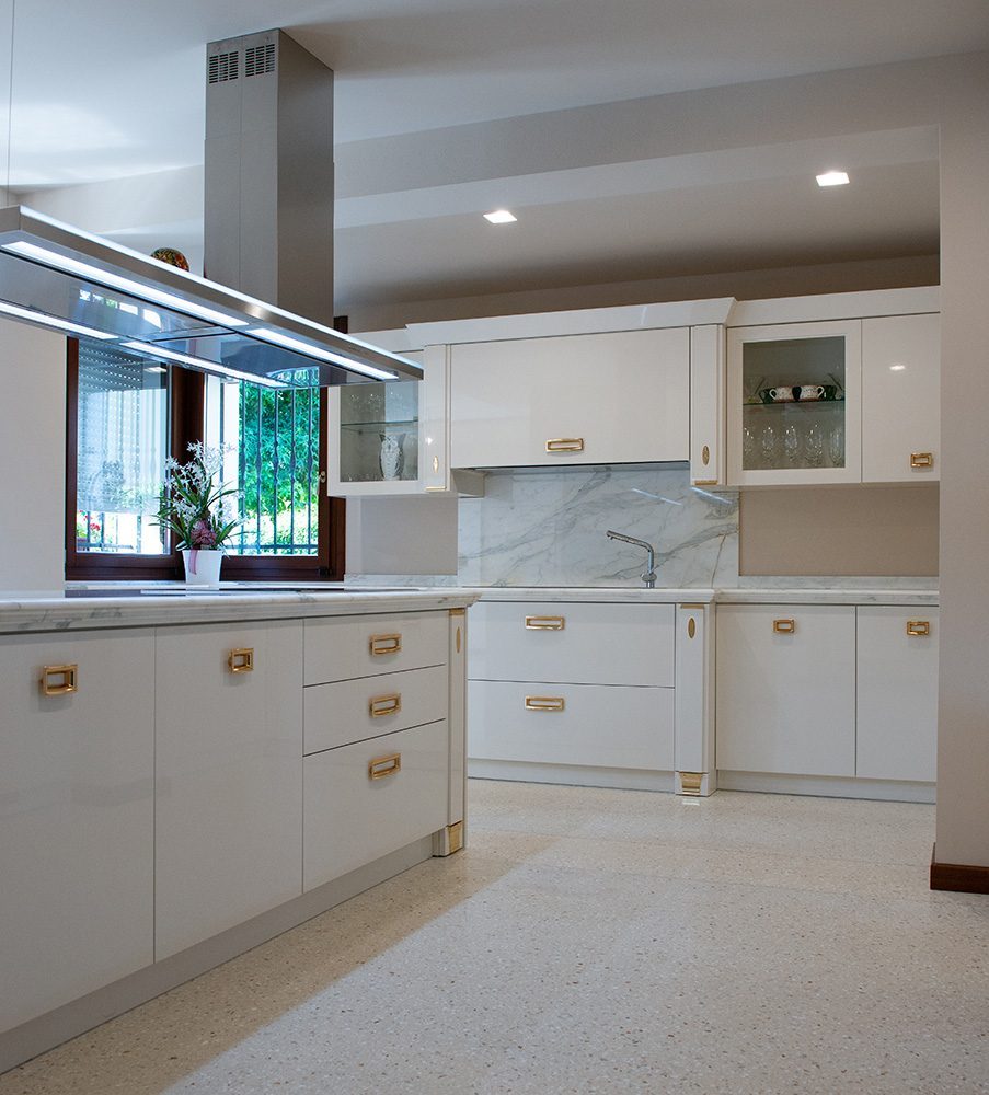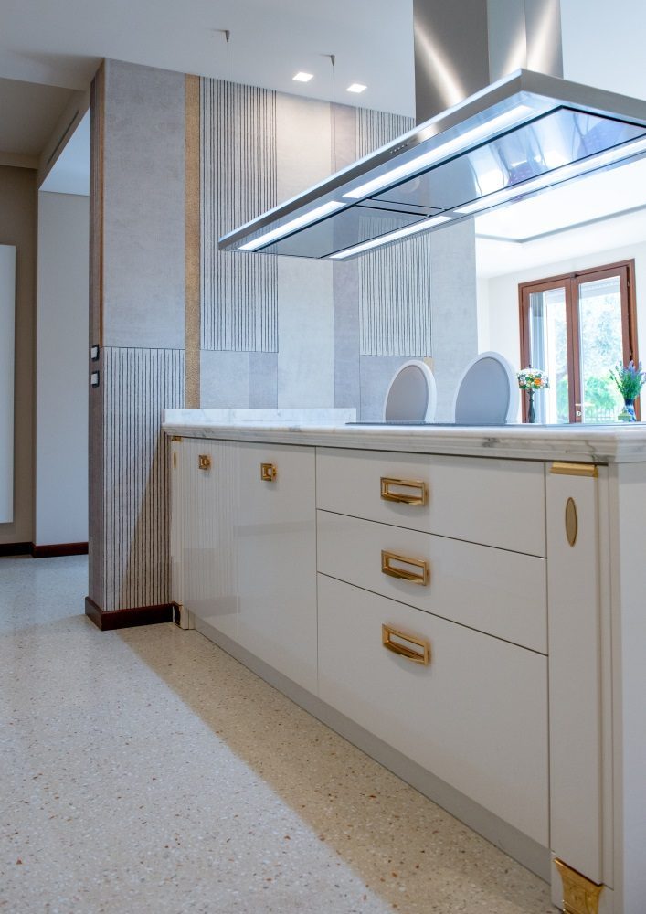 Il progetto di interior design della cucina in provincia di Verona si è trasformato nella riprogettazione dell’intera zona living. La divisione degli spazi, che consente la separazione tra cucina e living ma che, al contempo, preserva il senso di continuità stilistico, è stata progettata intervenendo sulla struttura preesistente: sono stati demoliti muri e riposizionati i termosifoni, per poi intervenire sulla pavimentazione, al fine di creare un ambiente elegante, armonico e raffinato.