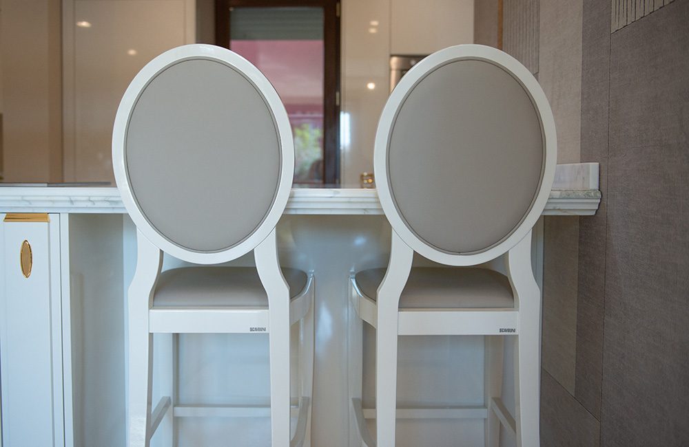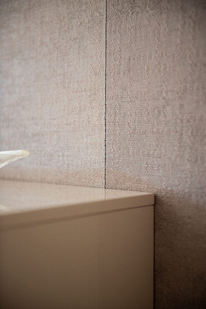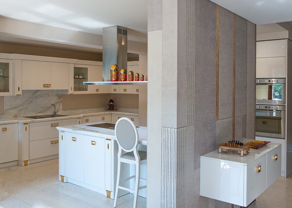 L’ampia e accogliente isola fa da trait d’union tra la cucina e il living, mentre il cartongesso crea una parete decorativa che richiama le note dorate dei mobili e che cela gli elementi strutturali da non concedere alla vista. La parete diviene così essa stessa un prezioso e raffinato elemento decorativo che contribuisce ad arricchire di personalità l’intero ambiente di casa.