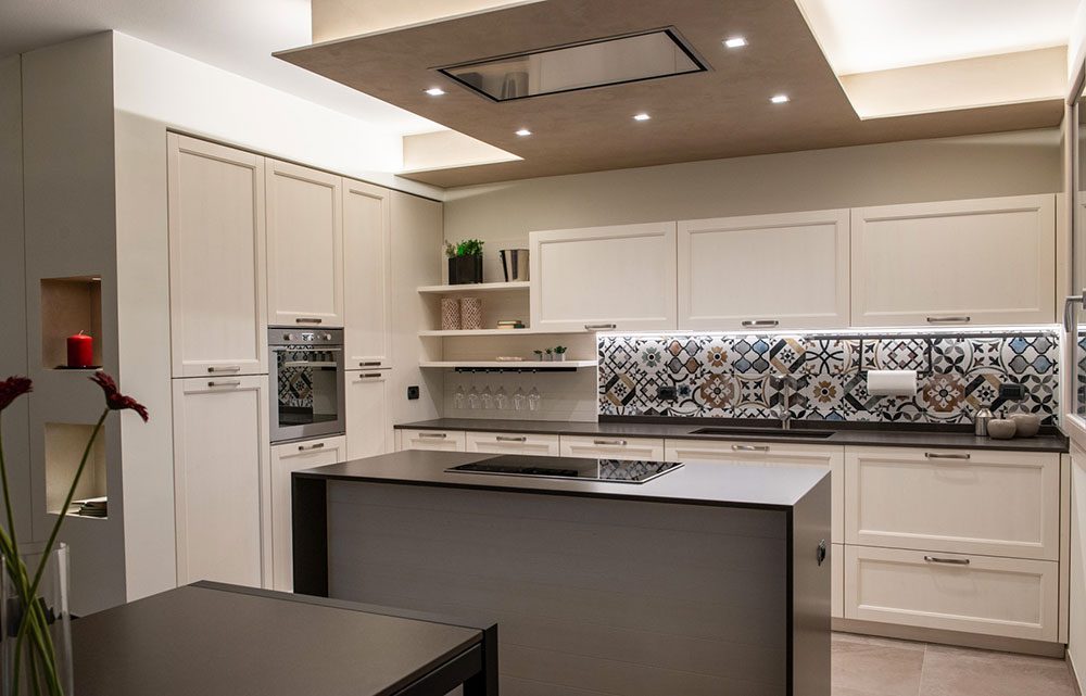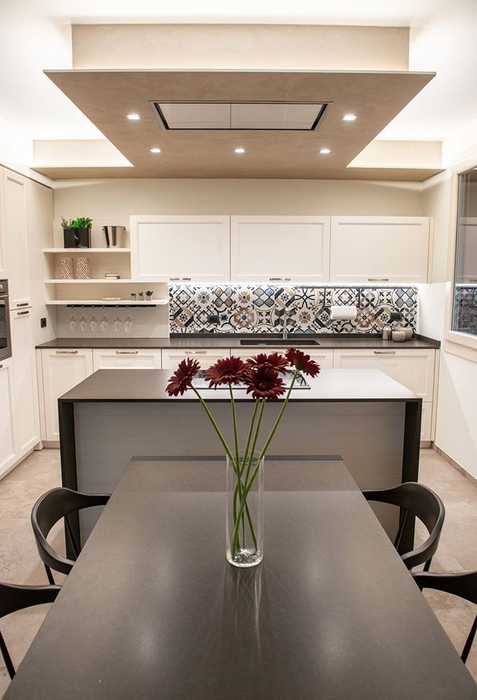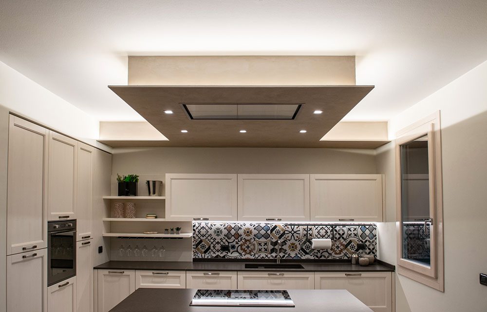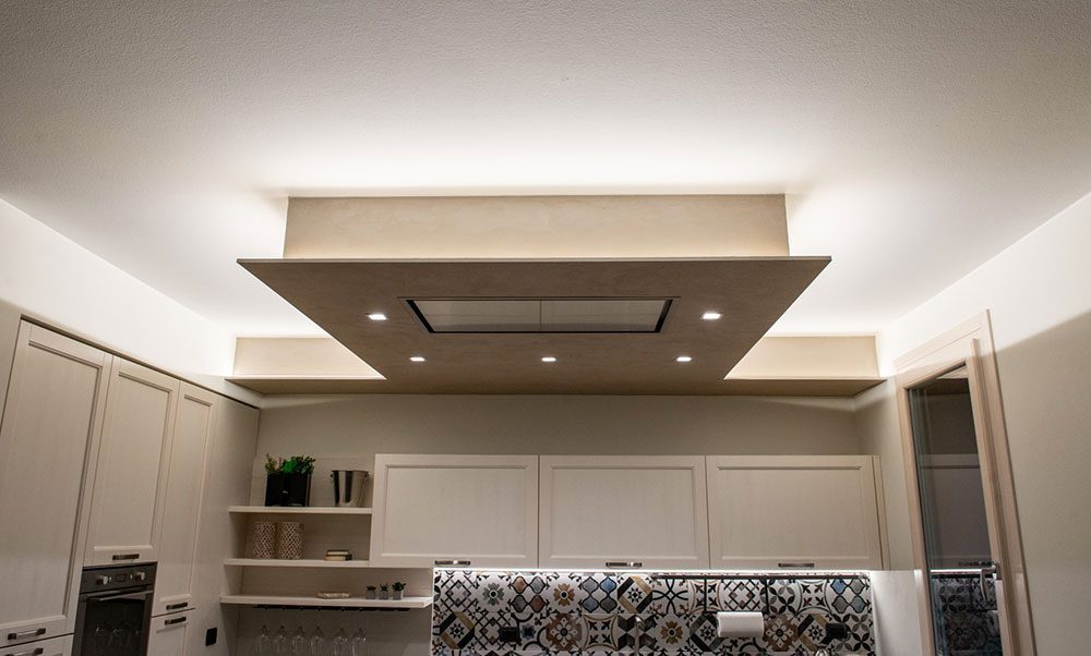 L’isola centrale della cucina è ubicata al di sotto della cappa integrata nel cartongesso, caratterizzata dalla presenza di una scia di luci a led che ne punteggia i contorni, contribuendo al contempo a fungere da discreto ed elegante punto luce.