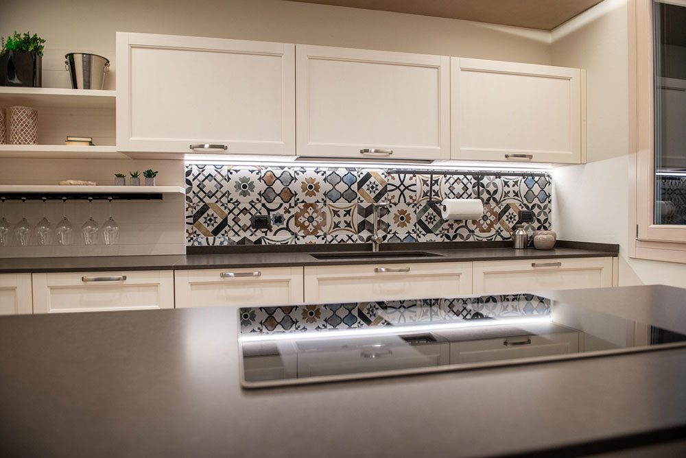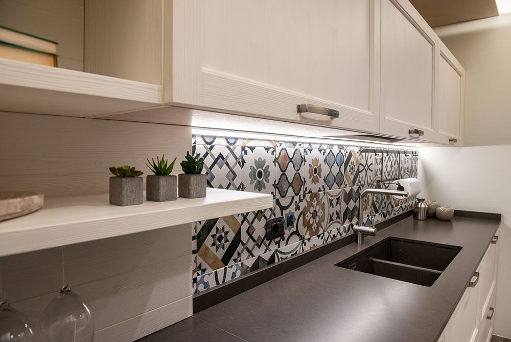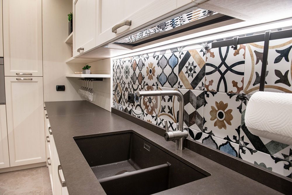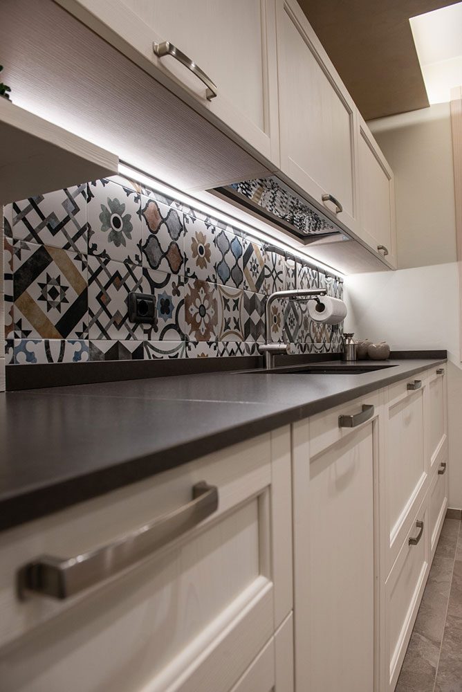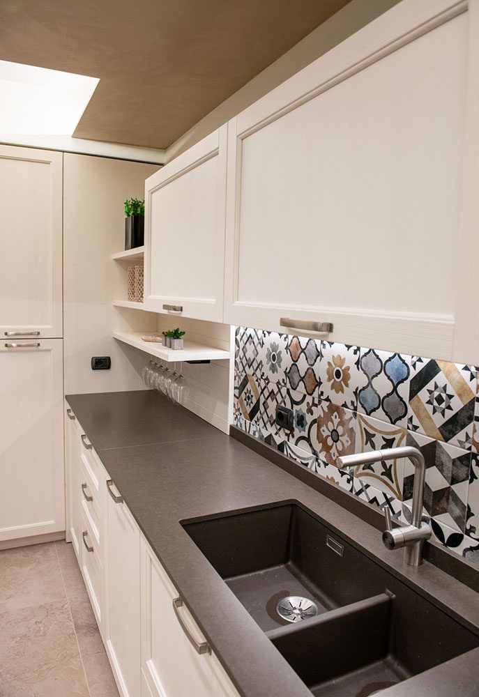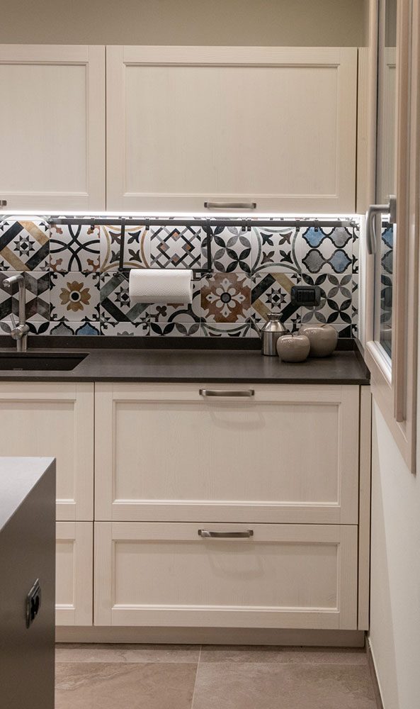Ma il vero focus dell’ambiente è un altro ed è rappresentato da un vivace paraspruzzi piastrellato impreziosito da una raffinata decorazione geometrica, i cui colori risultano perfettamente integrati con i toni chiari dominanti.