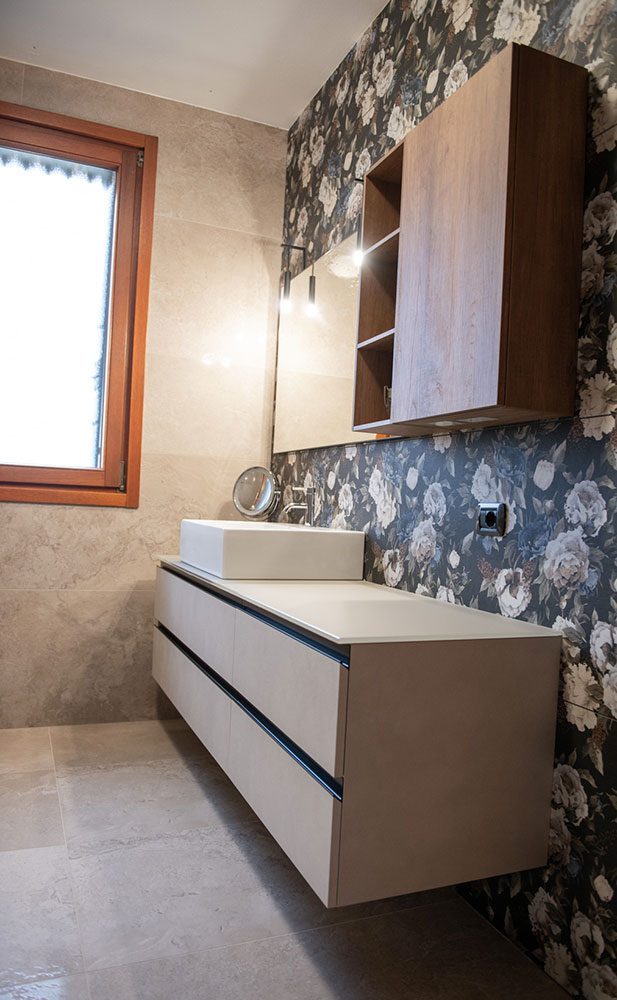 Entrando nel bagno completamento ristrutturato, si ha quasi l’impressione di essere giunti in un ambiente completamente diverso e, in un certo senso, è proprio così. Se, infatti, il pavimento in gres porcellanato è lo stesso presente in tutte le altre stanze, a cambiare drasticamente sono le pareti, modellate nei toni caldi del gres a effetto legno. L’impressione generale che si respira è dunque quella di una stanza molto più calda, vivacizzata da peculiari macchie di colore in corrispondenza delle nicchie: un escamotage volto a ricreare tanto delle eleganti mensoline porta – oggetti, quanto dei discreti e raffinati punti luce.
