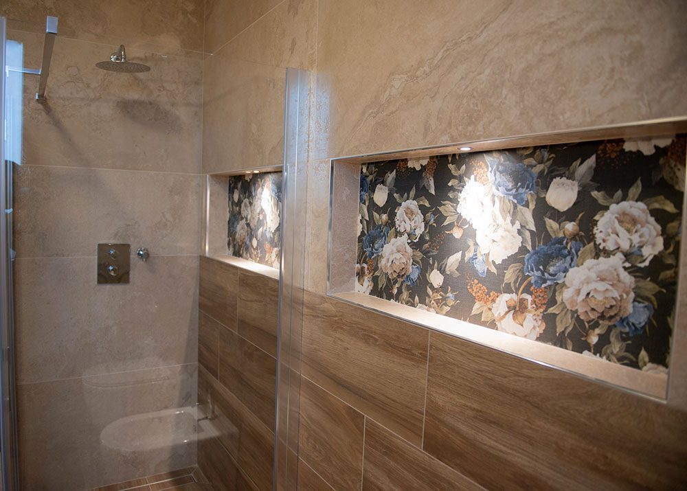 La peculiarità di queste nicchie scavate nelle pareti è data infatti dai led incassati al loro interno che, con la loro delicata luminosità, assolvono tanto una funzione pratica quanto estetica, valorizzando gli eleganti inserti decorativi posizionati dietro ciascuna nicchia.