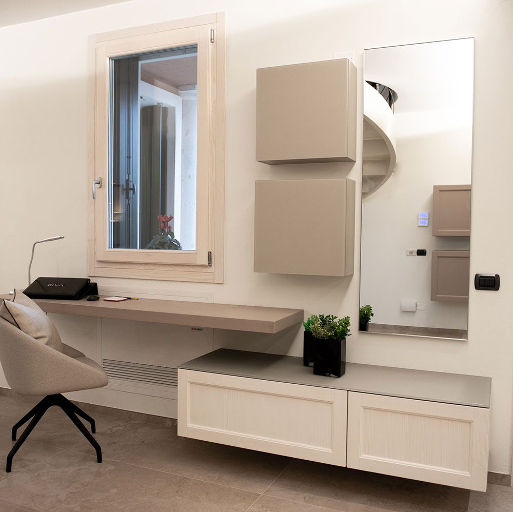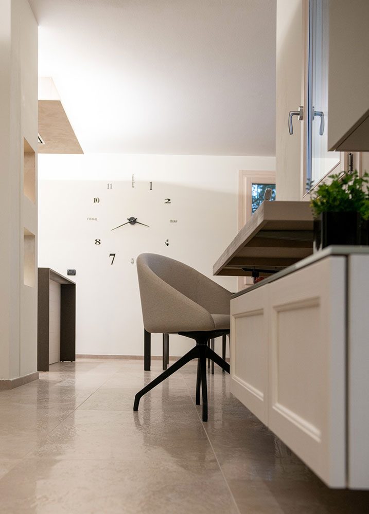 Posizionato di fronte alla scala trova posto un piccolo studio per lo smart working. La candida scrivania sospesa è corredata da una morbida poltrona imbottita, il cui color panna richiama i toni chiari delle pareti e, in generale, quelli dell’arredamento di tutta la casa.