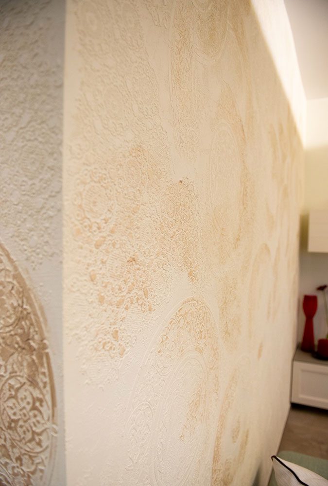 Tali inserti, sui quali sono dipinti delle meravigliose rose stilizzate, raggiungono il loro massimo splendore nella parete antistante, quella cui è addossato il mobile bagno con il lavandino d’appoggio. Qui la decorazione viene infatti applicata all’intera parete, valorizzando enormemente il mobilio a essa addossato.