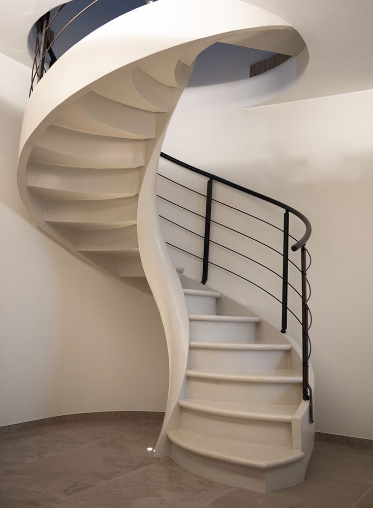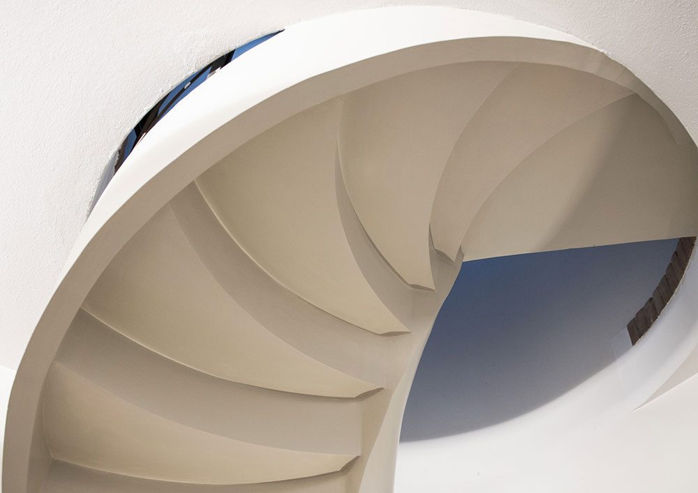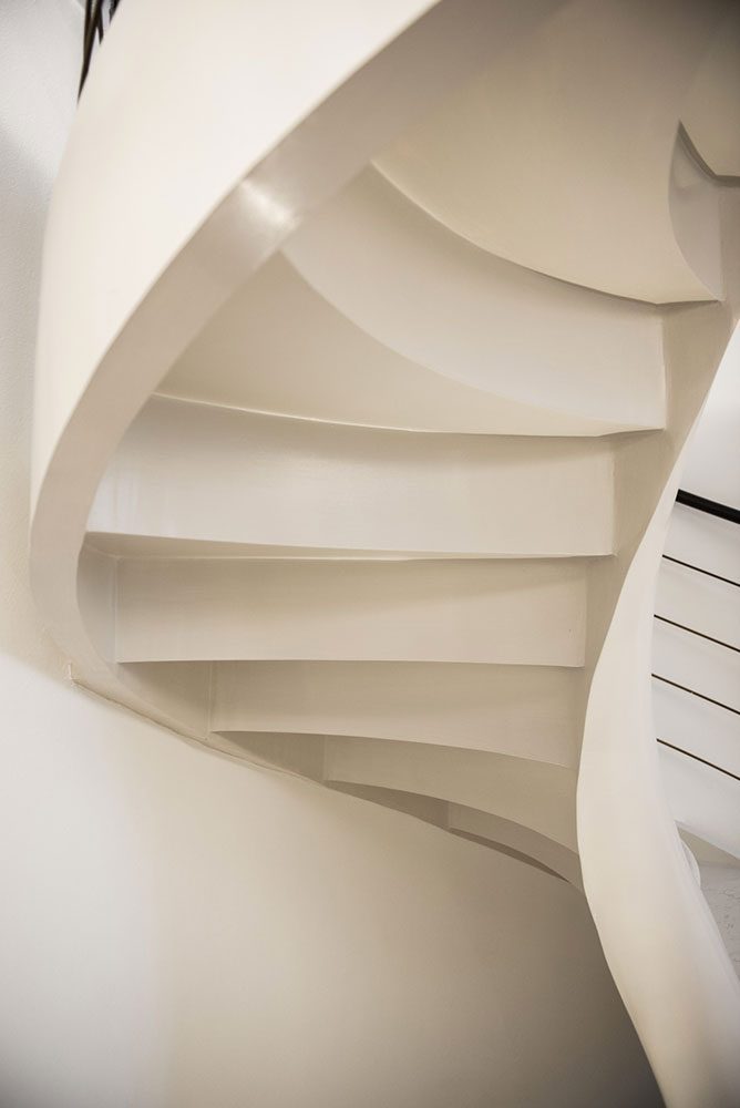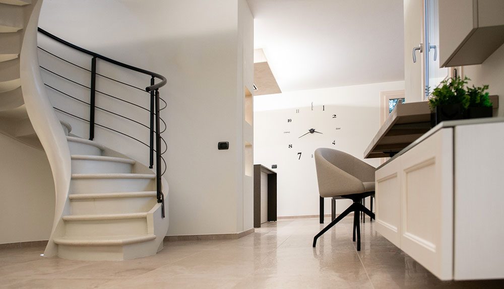La scala in questione, di forma elicoidale, caratterizzava già l’ingresso della casa, collocandosi pertanto come un elemento d’arredo preesistente.