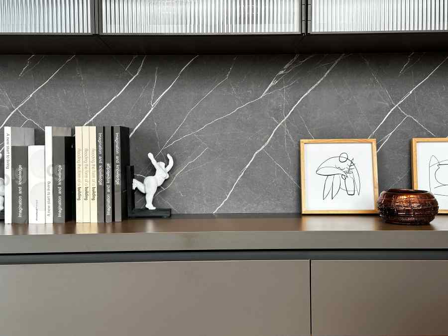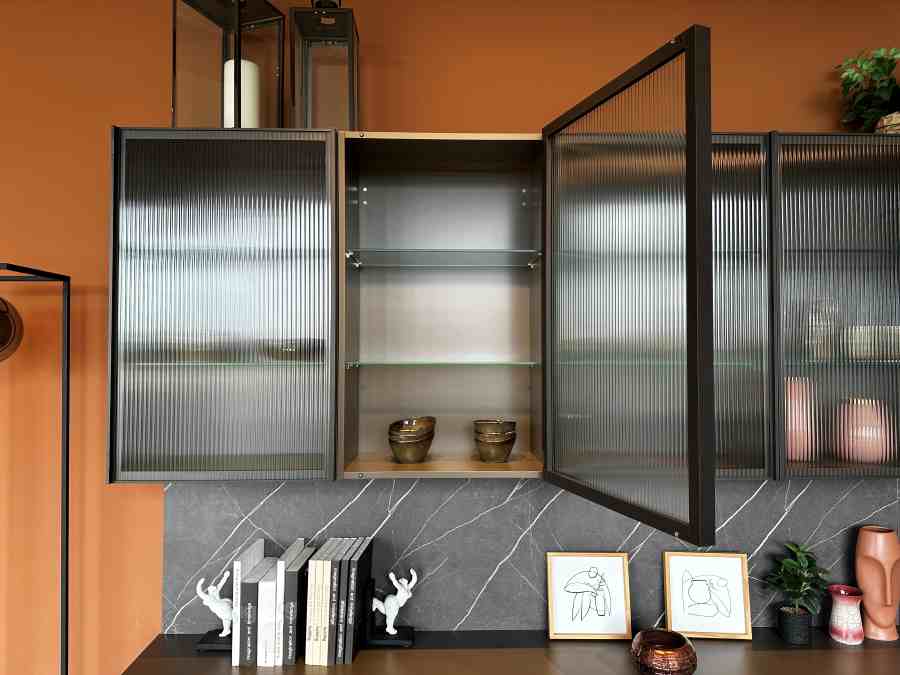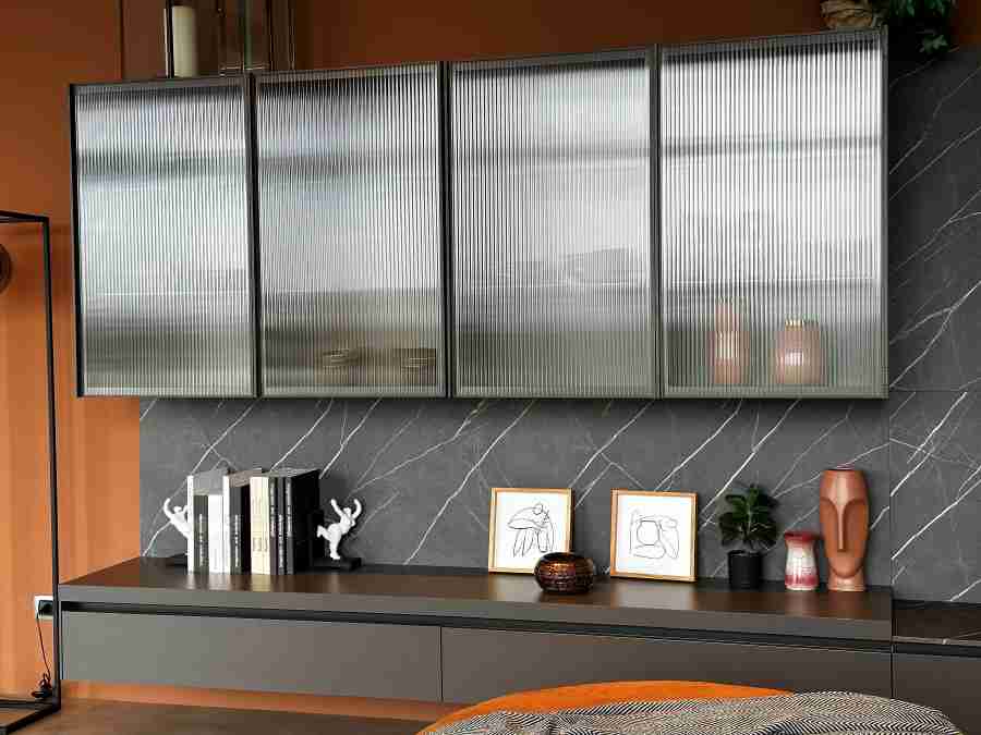 - Finitura: laminato Quarzo, ante vetrina con vetro cannettato, schienale in laminato effetto pietra